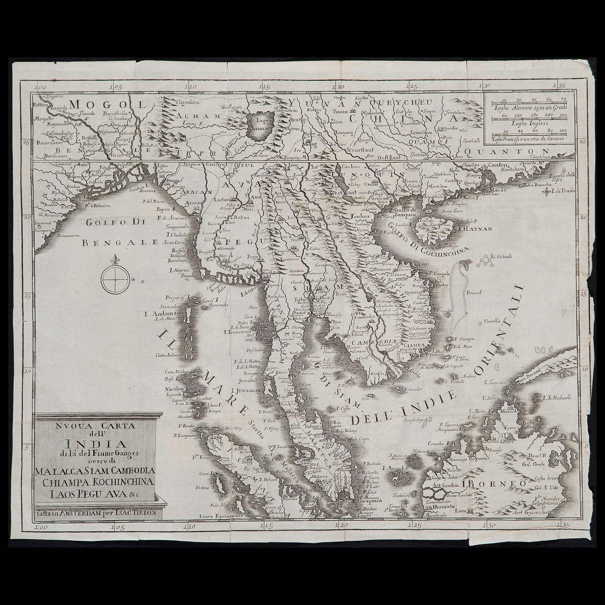Isaak Tirion (Utrecht 1705 – Amsterdam 1765), 'Nuova Carta dell'India', Amsterdam ca. 1740 Incisione su carta vergellata e filigrana, reca in basso a sinistra l'iscrizione 'Nuoua Carta dell'India di là del fiume Ganges overo di Malacca, Siam, Cambodia, C