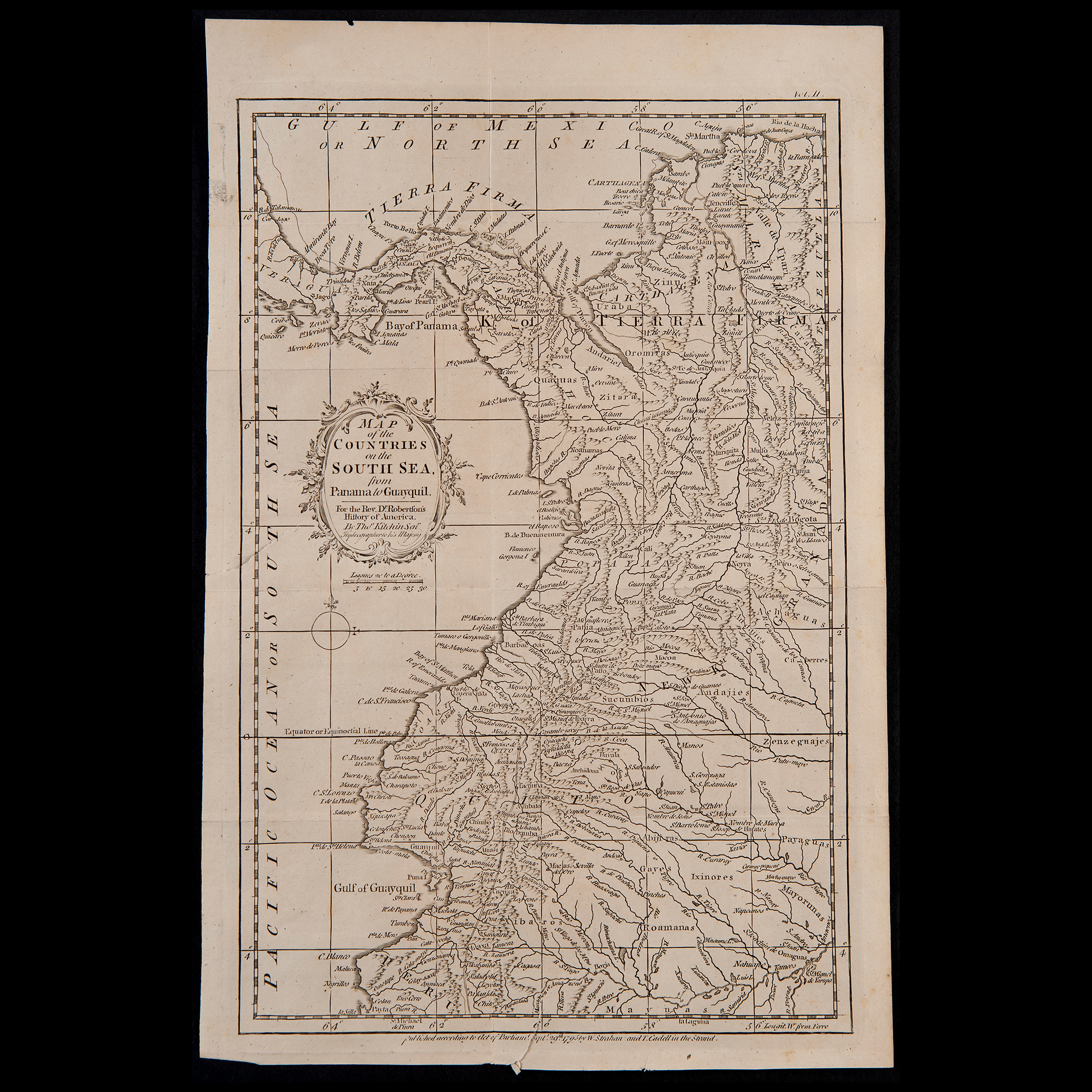 Thomas Kitchin (Inghilterra 1718 – 1784), 'Map of the countries on the South Sea from Panama to Guayquil', Londra 1777 Incisione desunta da volume di William Robertson 'The History of America', edita a Londra da W. Strahan & T. Cadell nel 1777. In calce