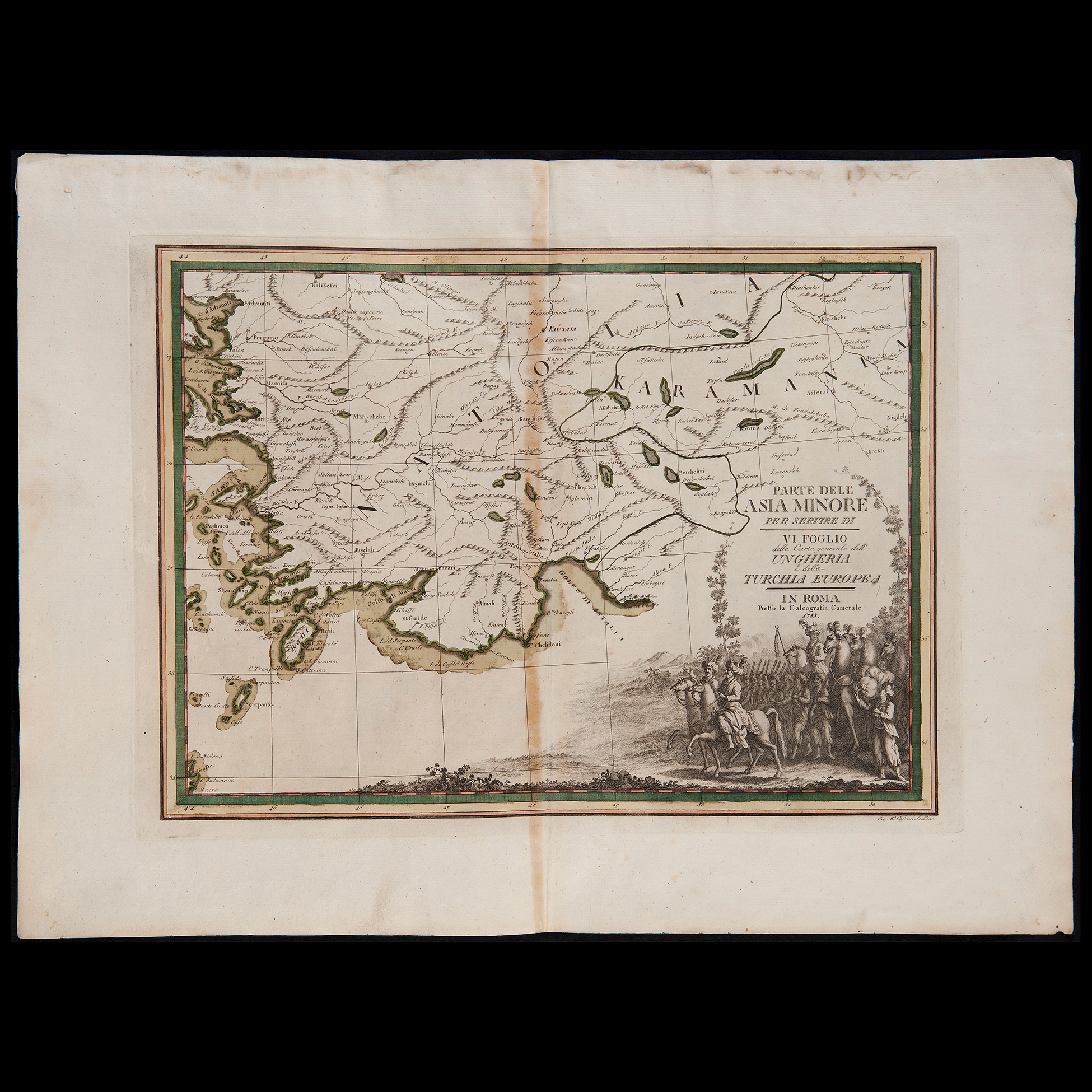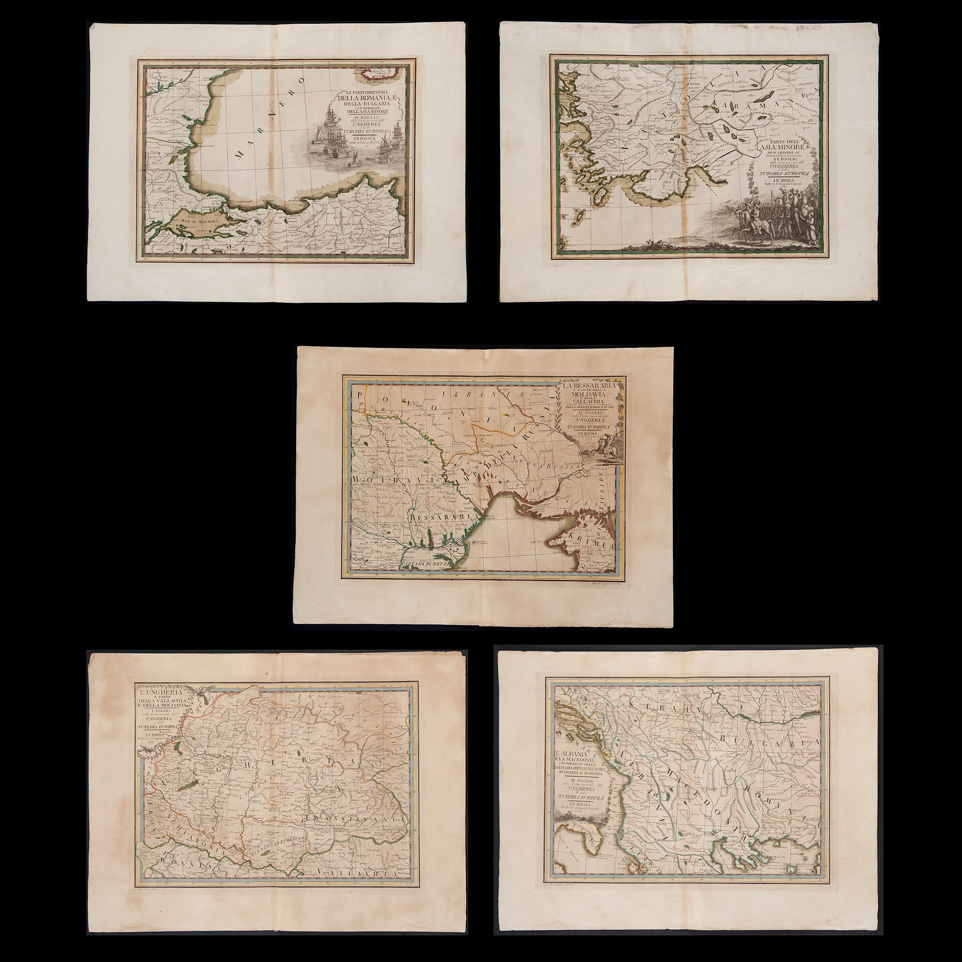 Giovanni Maria Cassini (Venezia 1745 – Roma 1824), 'Carta generale dell'Ungheria e della Turchia europea', Roma 1788 Lotto composto da cinque incisioni parzialmente dipinte su carta vergellata raffiguranti: 'Parte dell'Asia Minore', 'Le parti orientali d