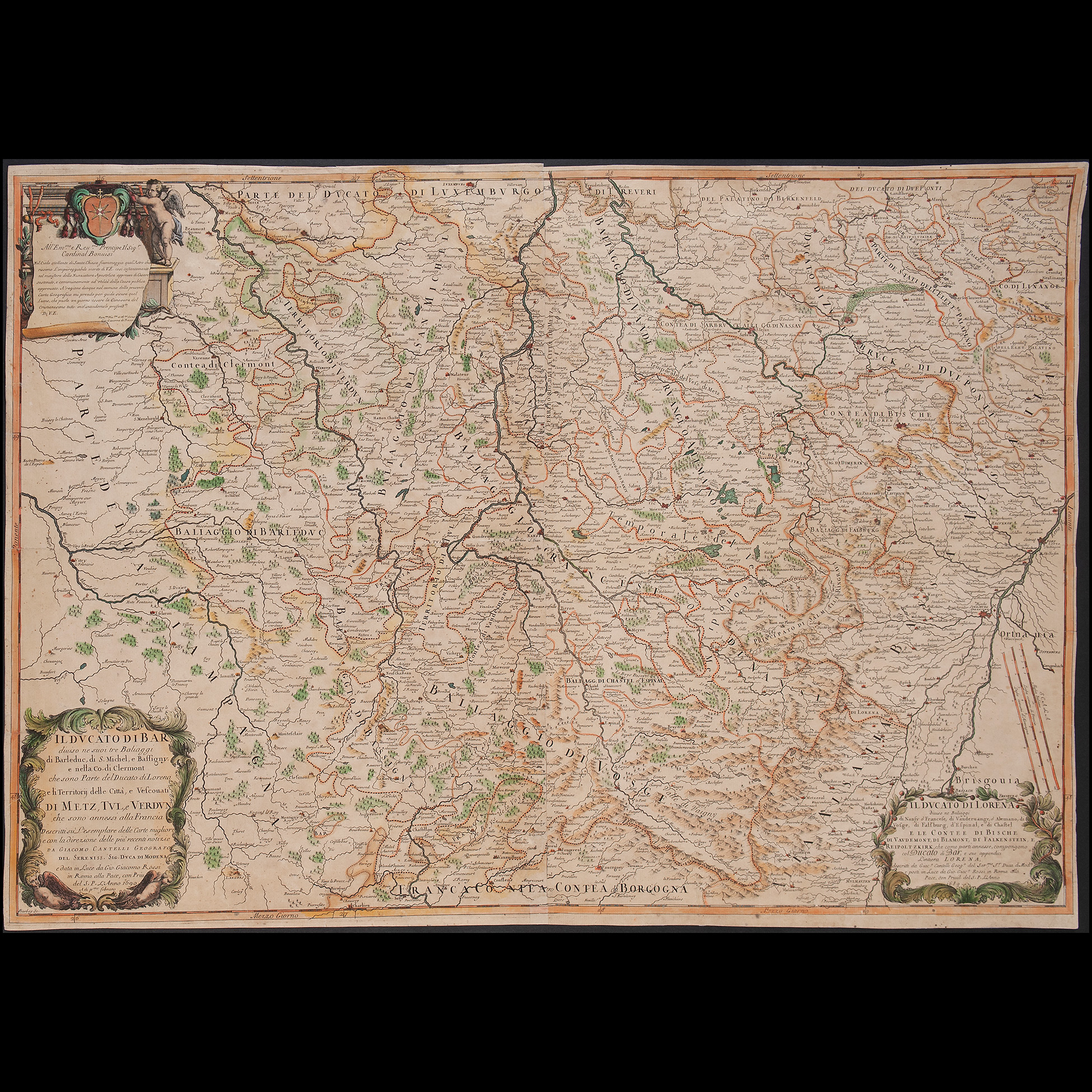 Giovanni Giacomo De Rossi (1627 – 1691) e Antonio Barbey (notizie 1689 - 1703), Carta geografica 'Il ducato di Bar, di Metz, Tul e Verdun e Il ducato di Lorena', 1689 - 90 Importante incisione su carta vergellata realizzata per il Cardinale Francesco Bon