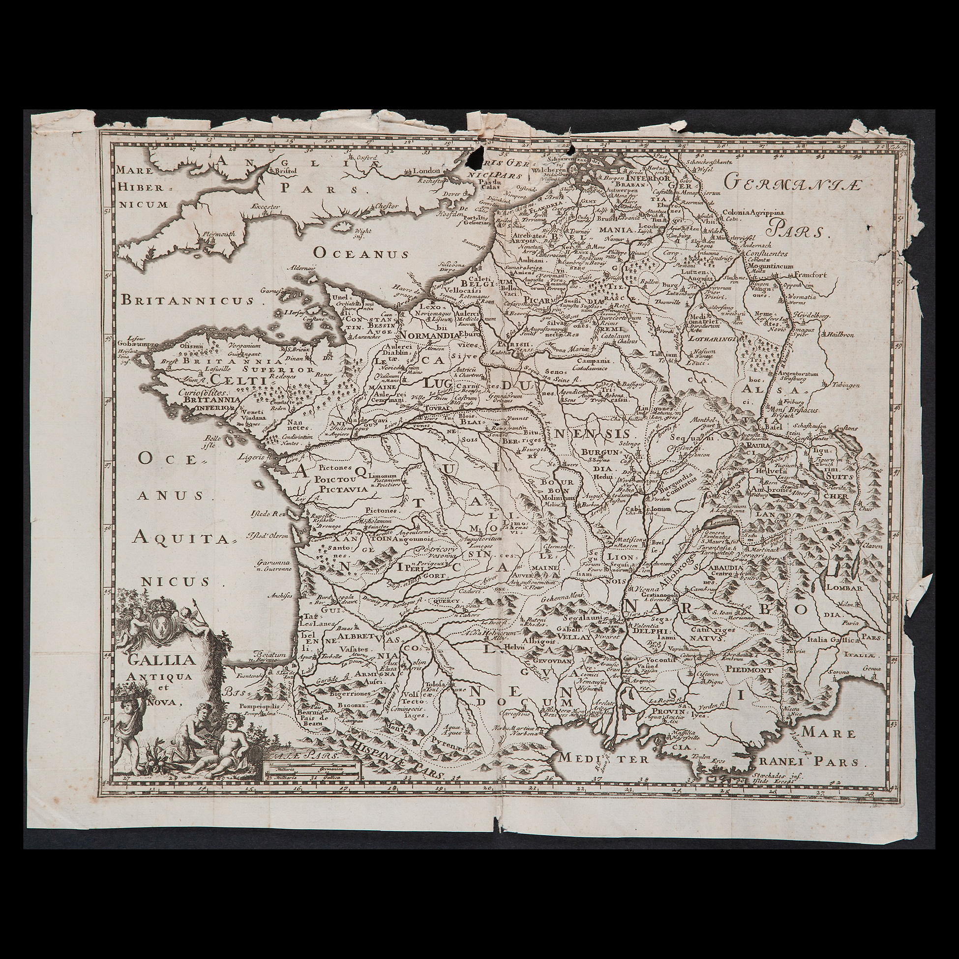 Carta geografica 'Gallia antiqua et nova', Italia inizi del XVIII secolo? Incisione su carta vergellata e filigrana, presenti difetti e priva di cornice Incisione su rame, dimensioni 29x36 cm.
