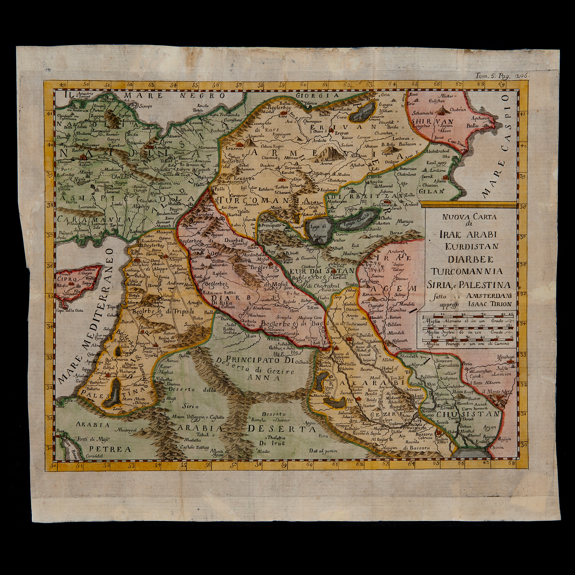 Isaak Tirion (Utrecht 1705 – Amsterdam 1765), 'Nuova carta di Irak Arabi, Kurdistan, Diarbek, Turcomannia, Siria e Palestina', Amsterdam 1742 Incisione su carta vergellata e filigrana tratta dall'opera 'Atlante novissimo che contiene tutte le parti del m
