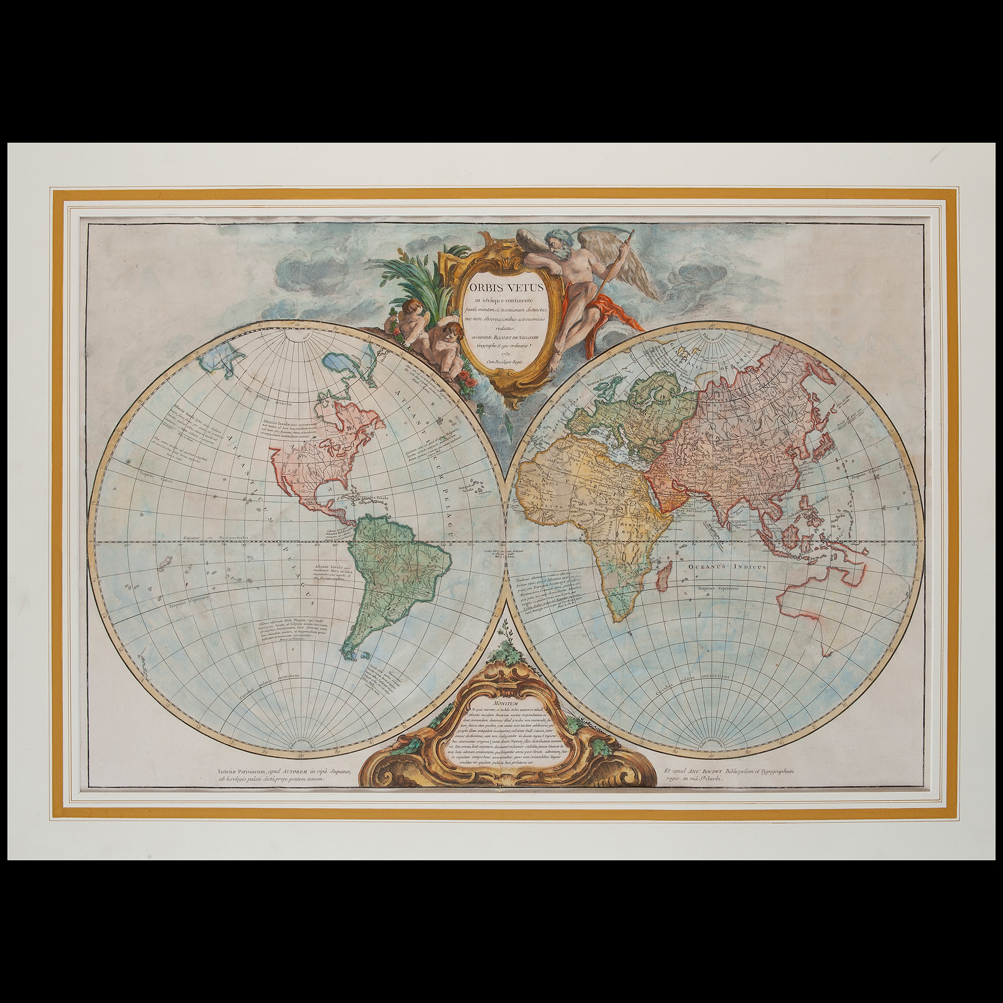Gilles Robert de Vaugondy (1688-1766), 'Orbis Vetus', Francia 1752 Importante incisione acquerellata, reca nel cartiglio al centro della composizione l'iscrizione 'Orbis Vetus in utraqu e continente - jusctà mentem Sensonianam distinctus, nec non observa