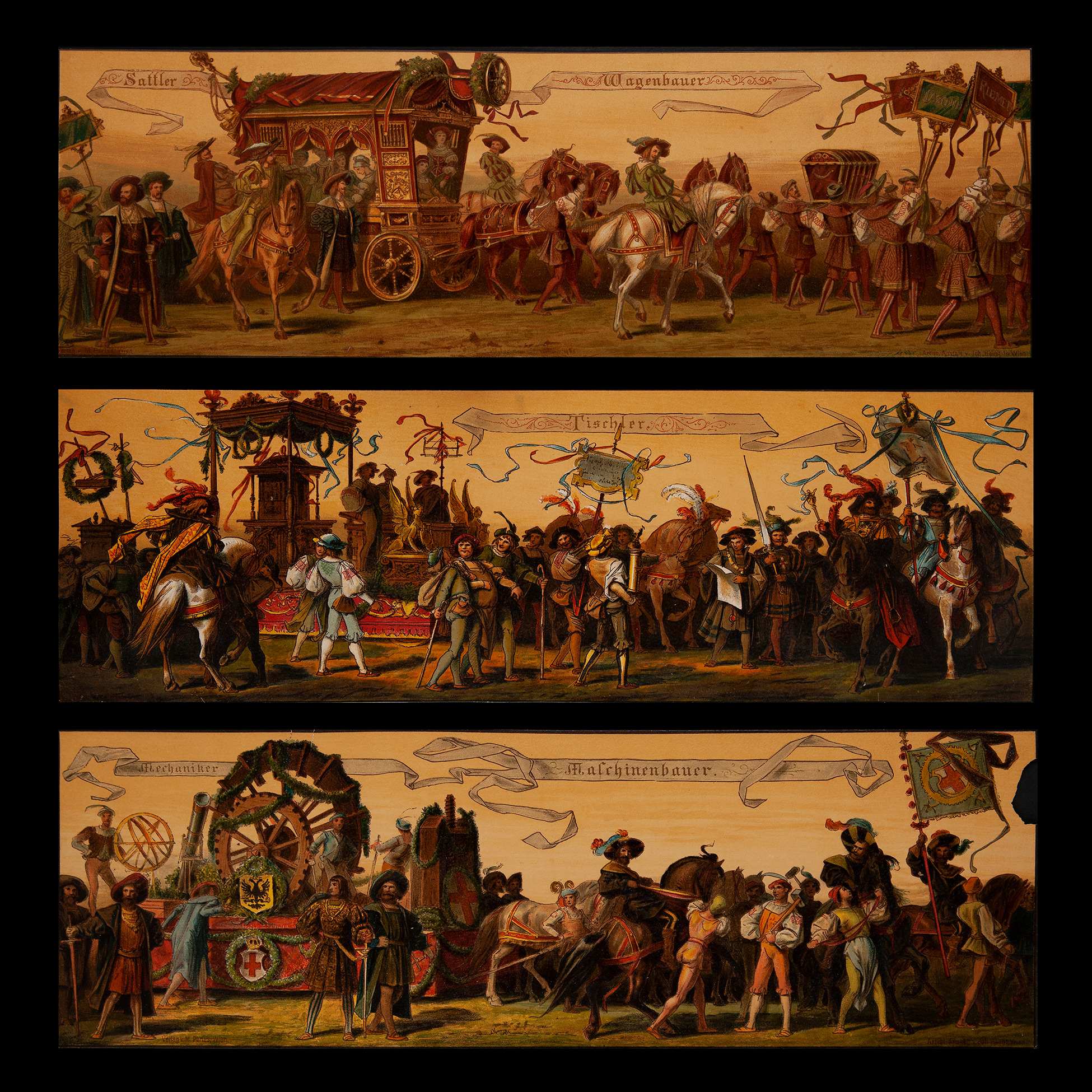 Anstalt v.Joh. Haupt, Le corporazioni delle arti e dei mestieri di Vienna, Austria XVIII secolo Gruppo di tre importanti cromolitografie firmate in calce 'Verlag v. M. Perles Wien - Artist Anstalt v. Joh. Haupt in Wien', raffiguranti i Fabbricanti di Car