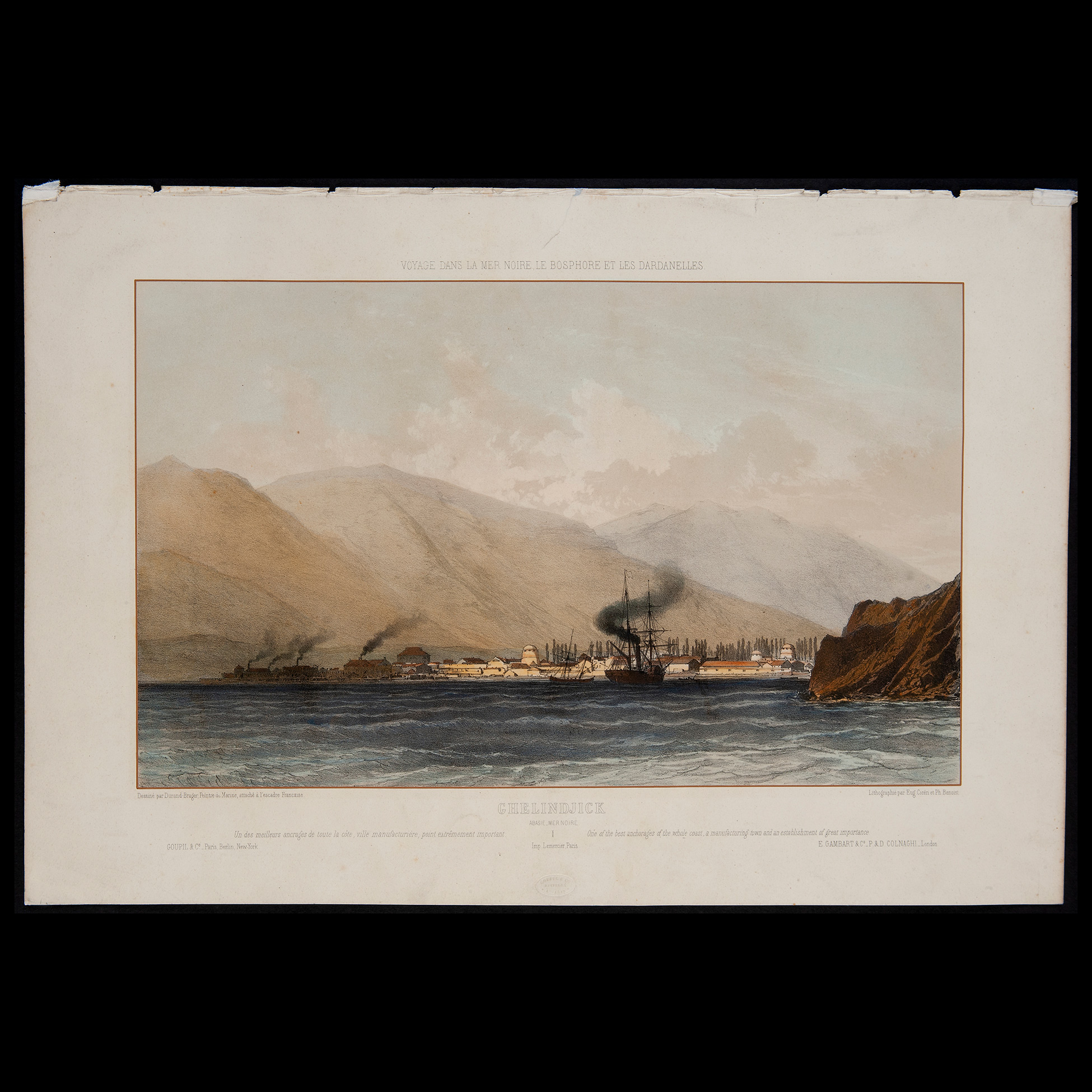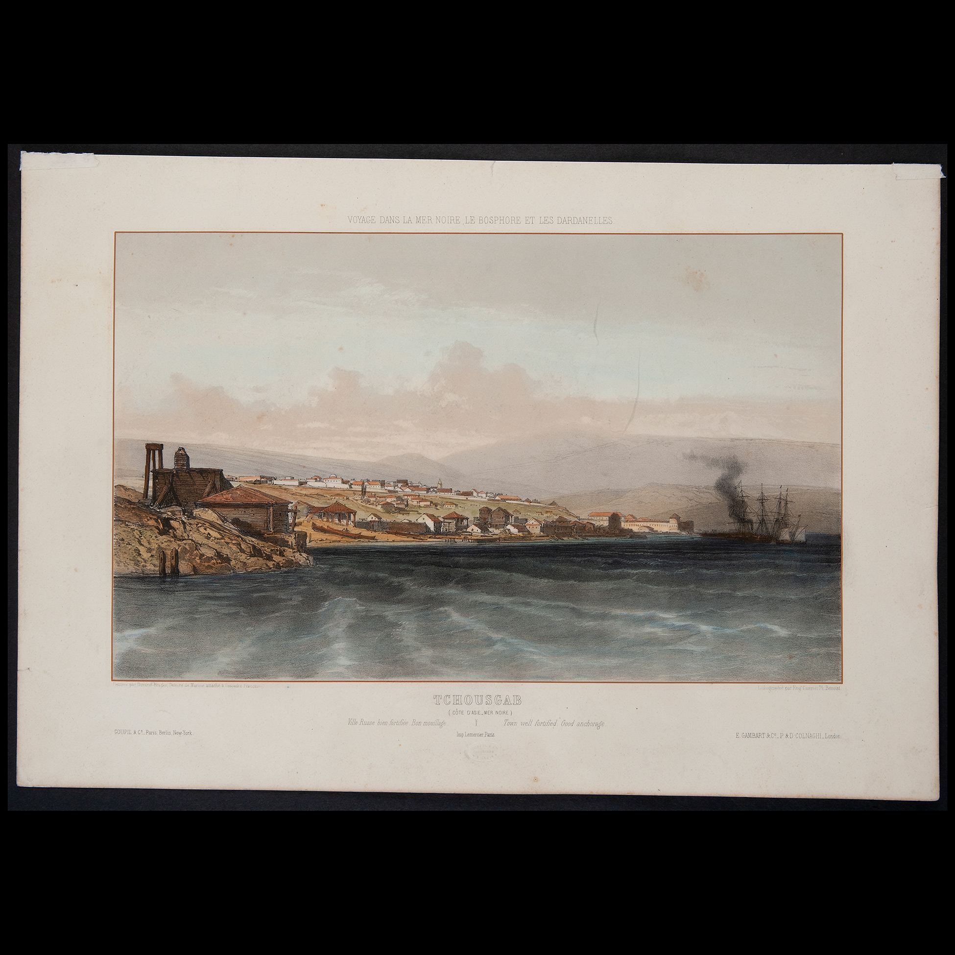 Coppia di litografie francesi 'Voyage dans la Mer Noire, le Bosphore, la Mer de Marmara & les Dardanelles', Parigi 1854 Opere grafiche raffiguranti 'Ghelindjick' e 'Tchousgab', recanti le seguenti iscrizioni 'Ghelindjick Abasie, Mer Noire - Dessiné par D