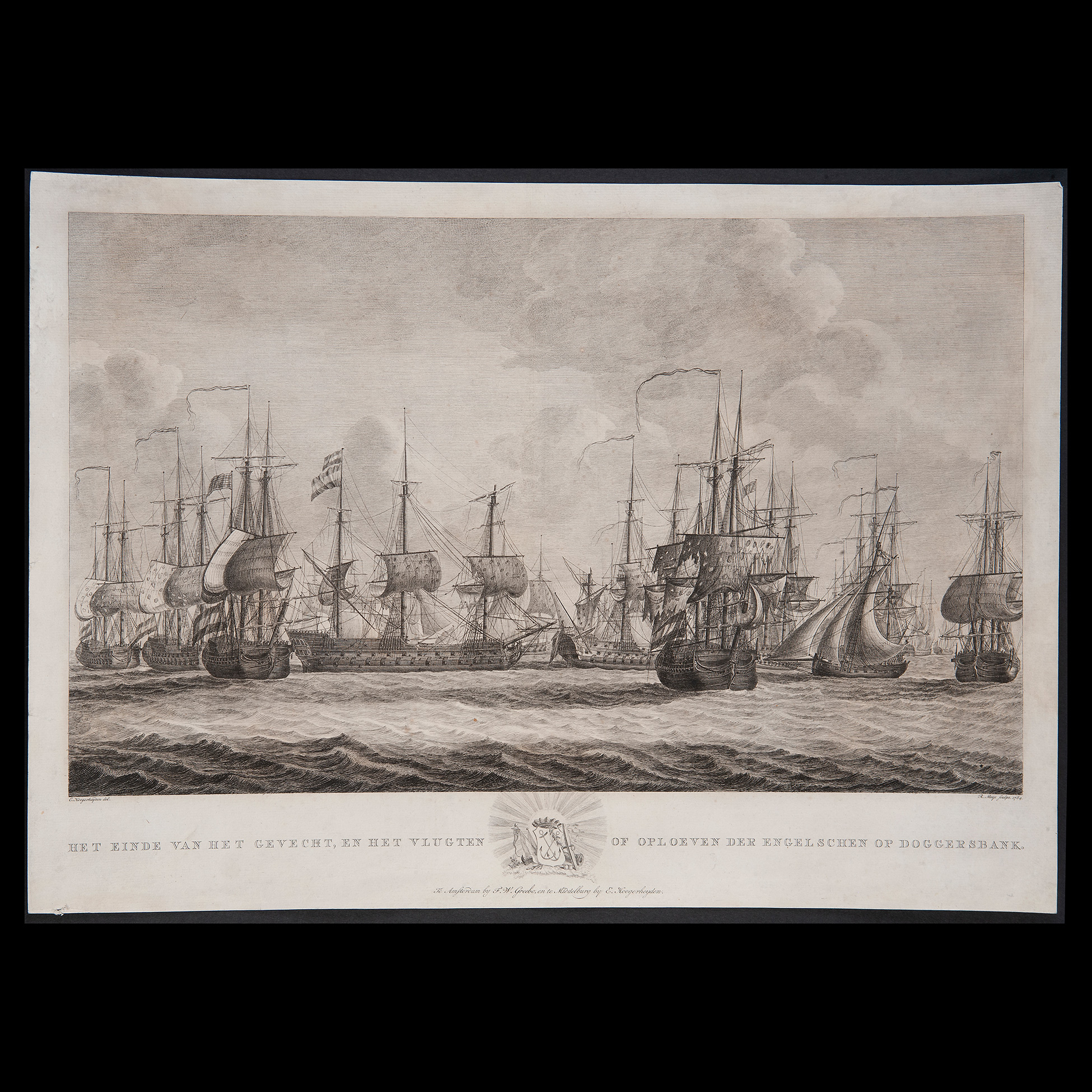 Robbert Muys (1742 - Rotterdam 1825), Battaglia navale di Dogger Bank, Paesi Bassi 1784 Incisione realizzata su carta vergellata e filigrana, presenta in calce l'iscrizione 'Het einde van het gevecht, en het vlugten of oploeven der engelschen op Doggersb