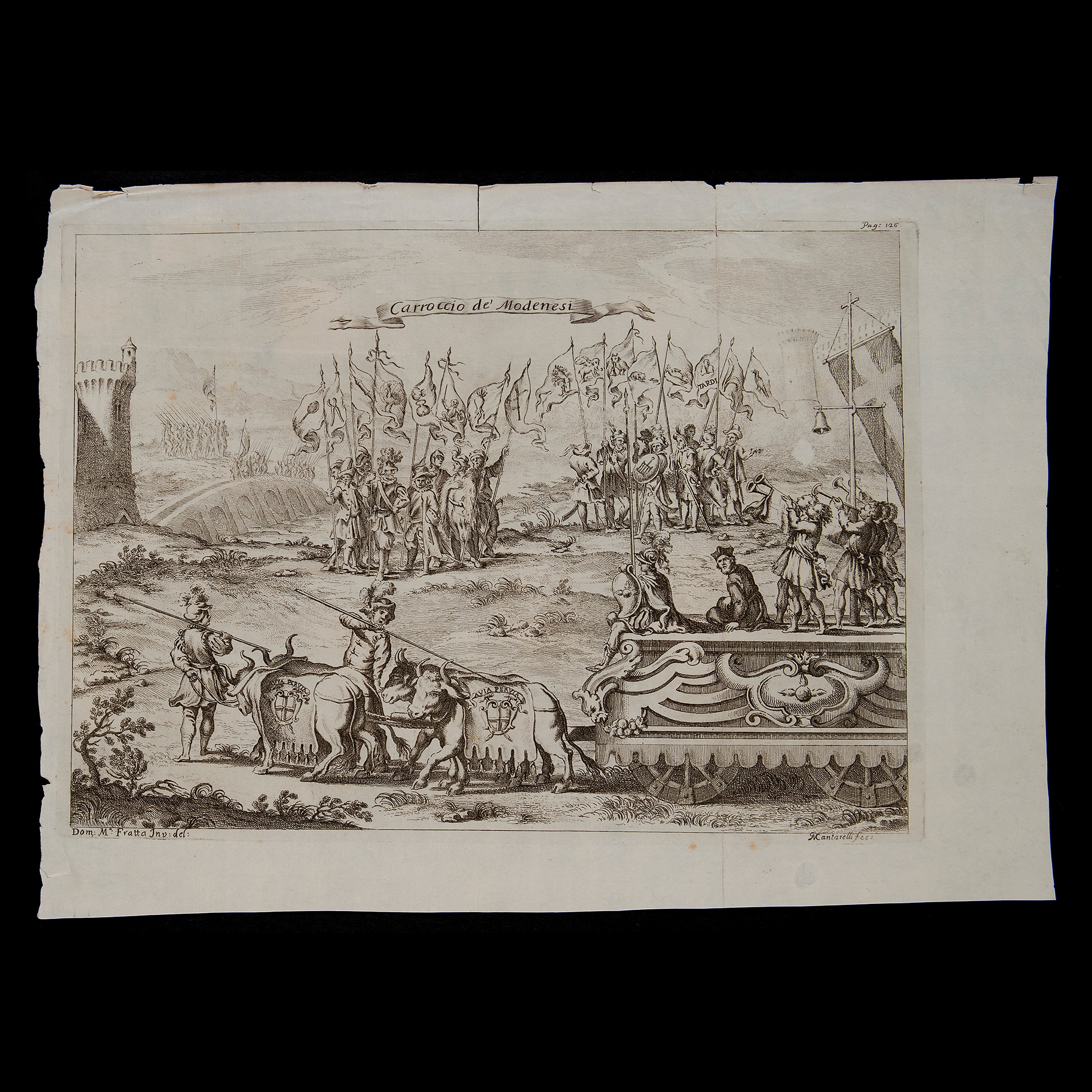 Giuseppe Maria Cantarelli (notizie 1736-1744), 'Carroccio de' Modenesi', Italia inizi del XVIII secolo Incisione realizzata su carta vergellata e desunta da un'opera di Domenico Maria Fratta pittore ed incisore bolognese, formatosi nella sua città natale