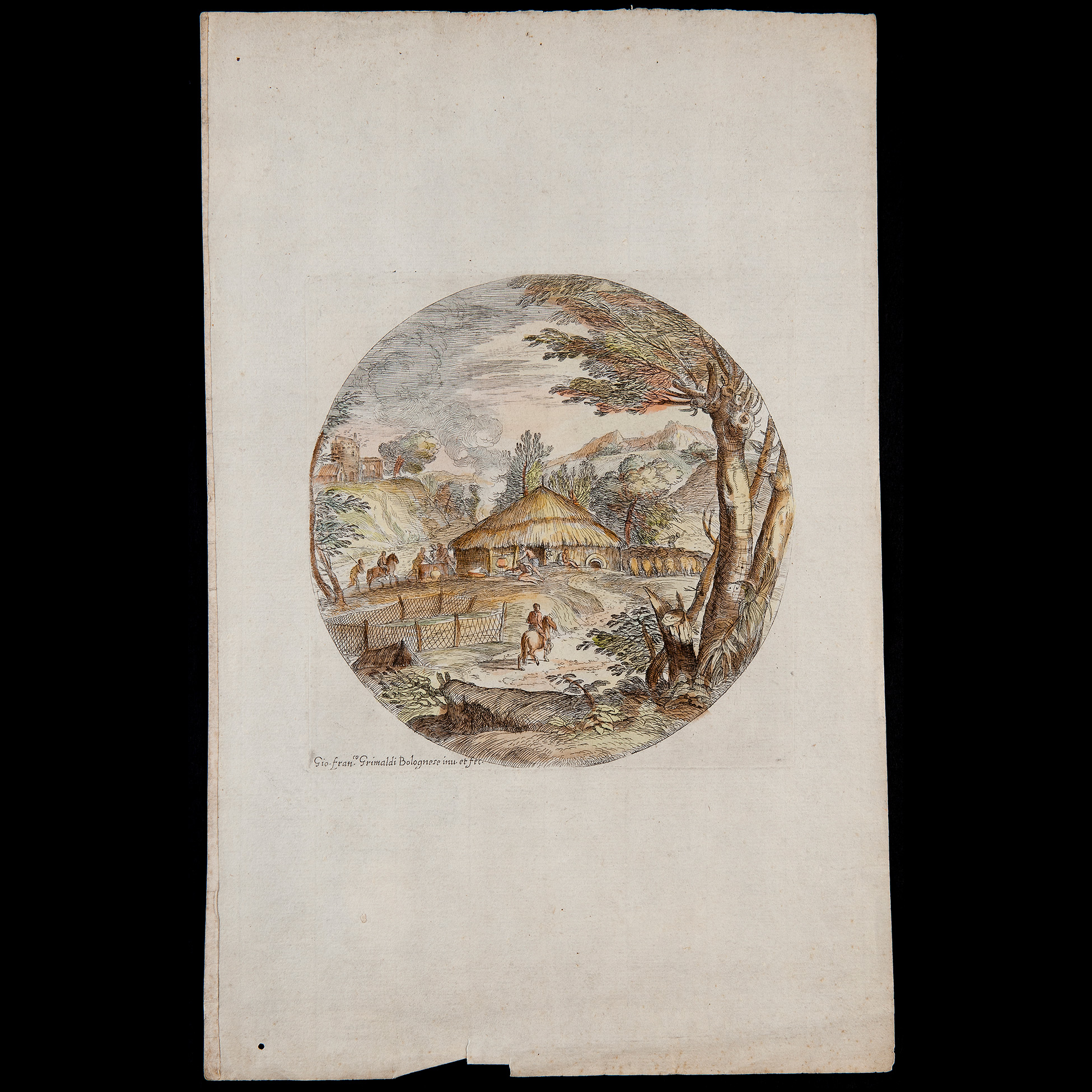 Giovanni Francesco Grimaldi (Bologna 1606 – Roma 1680) Paesaggio rurale, Bologna metà del XVII secolo Incisione dipinta su carta vergellata, reca l'iscrizione 'Gio. fran.co Grimaldi Bolognese inv. Et fec', presenti difetti, priva di cornice Incisione su