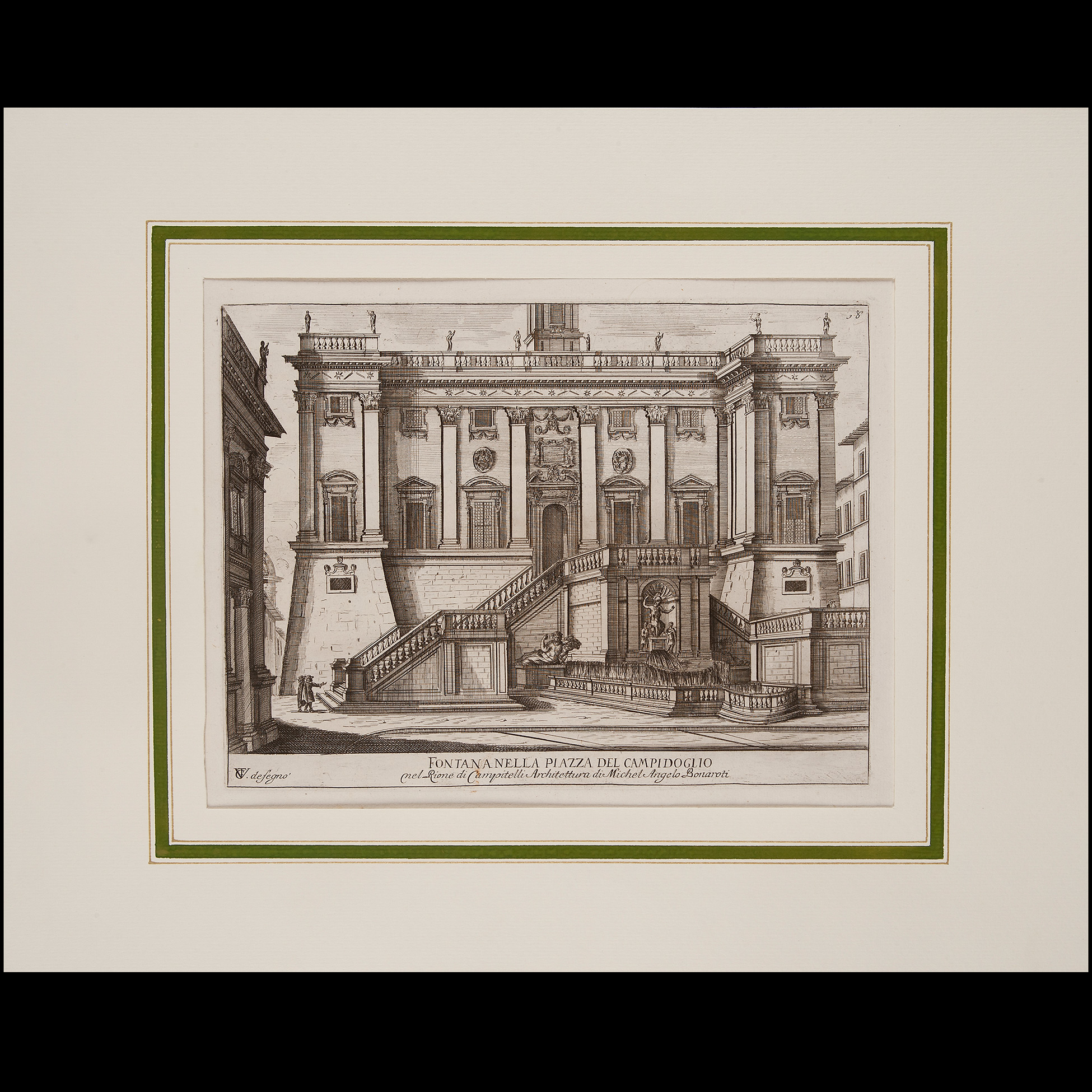 Giuseppe Tiburzio Vergelli (Camerino 1551 – Recanati 1609), 'La fontanella nella Piazza del Campidoglio', fine del XVI secolo Pregevole incisione originale all'acquaforte e bulino, reca in calce il monogramma dell'artista 'GTV desegnò' e l'iscrizione 'Fo
