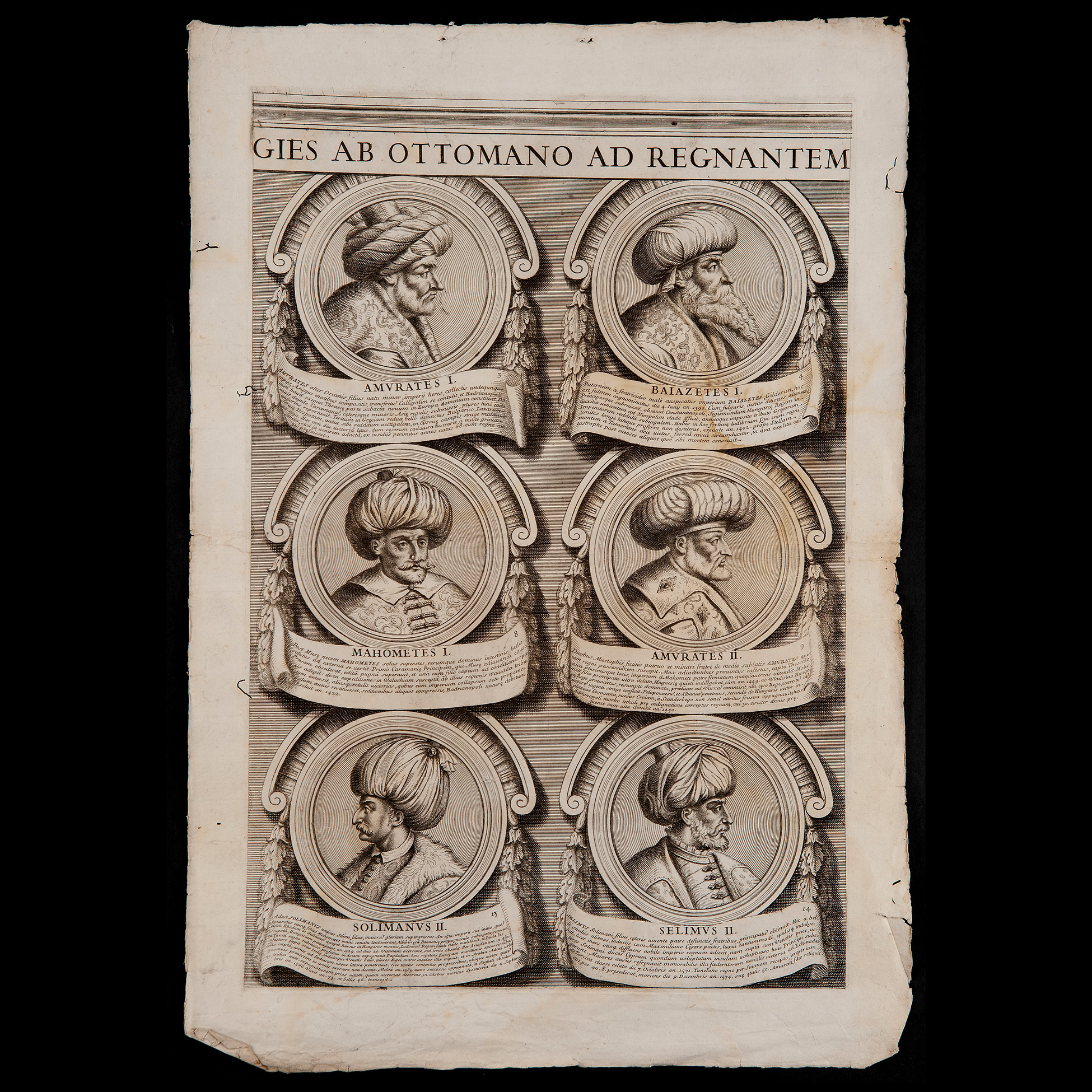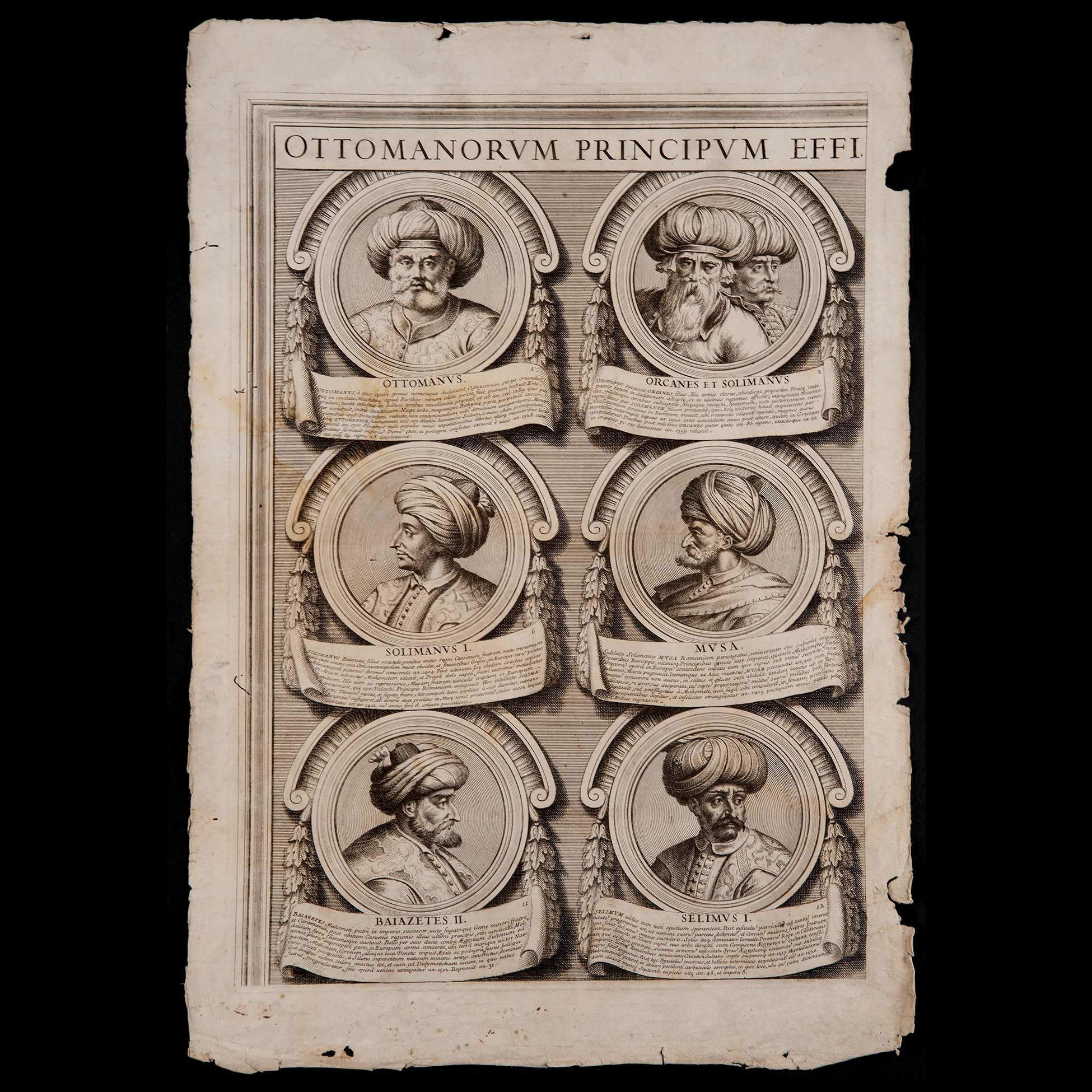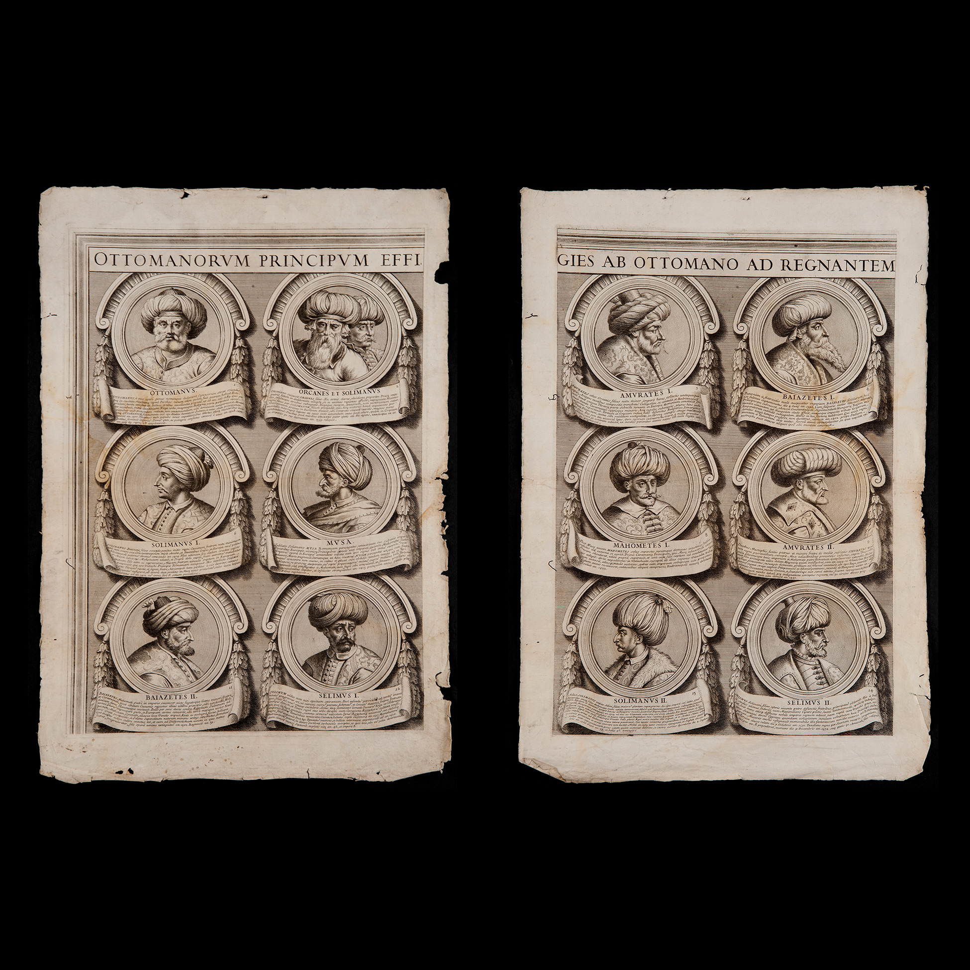 Julius Mandosius, Ottomanorum principum effigies, 1699 Coppia di pagine su carta vergellata filigranata raffiguranti i principi ottomani. Presenta in alto l'iscrizione 'Ottomanorum principum effigies ab ottomano ad regnantem'. Sono effigiati: Ottomanus,