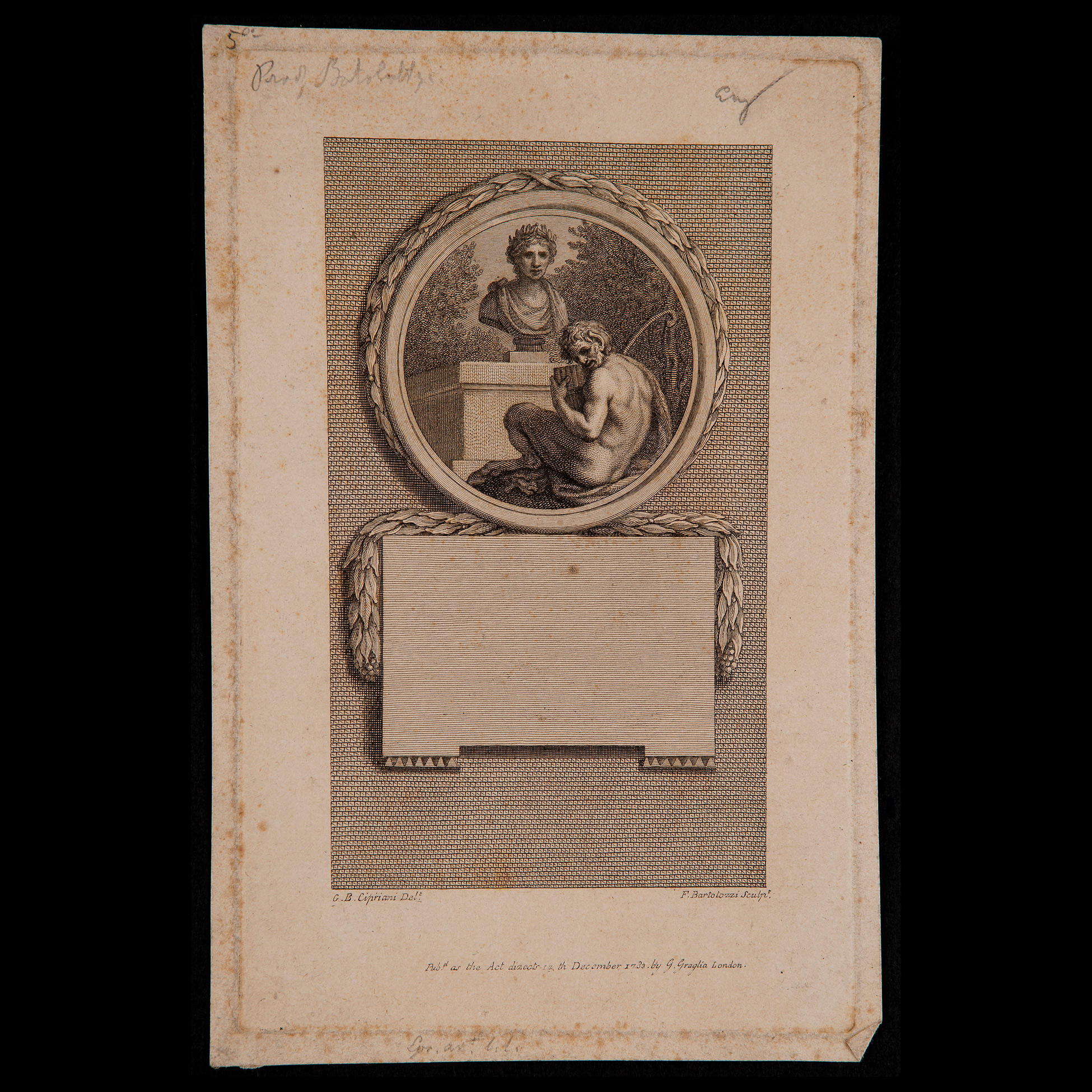 Giovanni Battista Cipriani (Firenze 1727 – Hammersmith e Fulham 1785), Satiro che suona il flauto di Pan sotto il busto del poeta Marziale, 1783 Incisione su carta vergellata tratta da 'Giuspanio Graglia, Tutti gli epigrammi di M. Val. Marziale, Londra 1