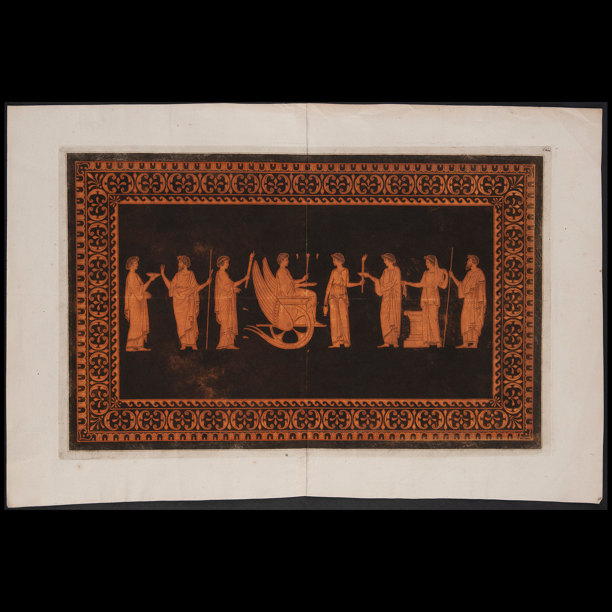 Sir William Douglas Hamilton (Henley-on-Thames 1730 – Londra 1803), Scena classica a figure rosse da vaso greco, 1766-1776 Acquatinta su carta vergellata dipinta a mano tratta dall'importante volume 'Le antichità etrusche greche e romane' (1766-1776), pr