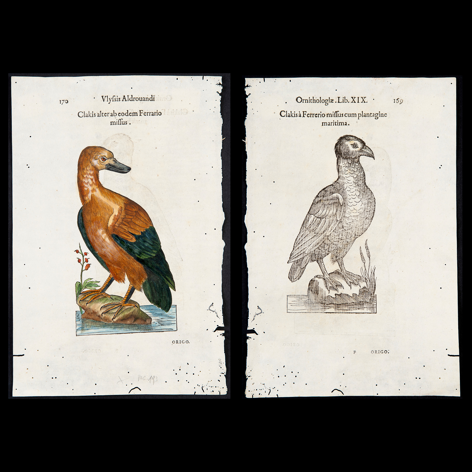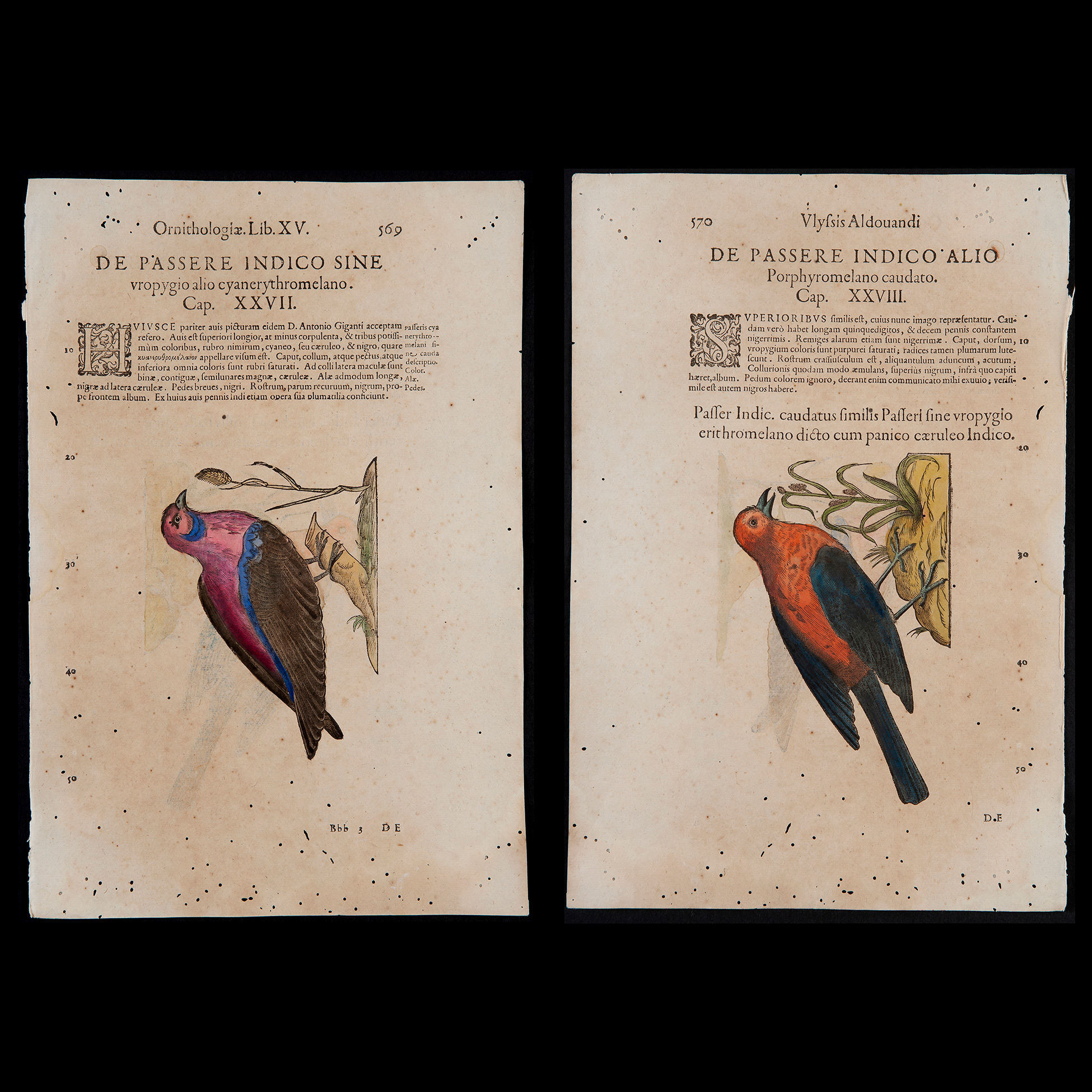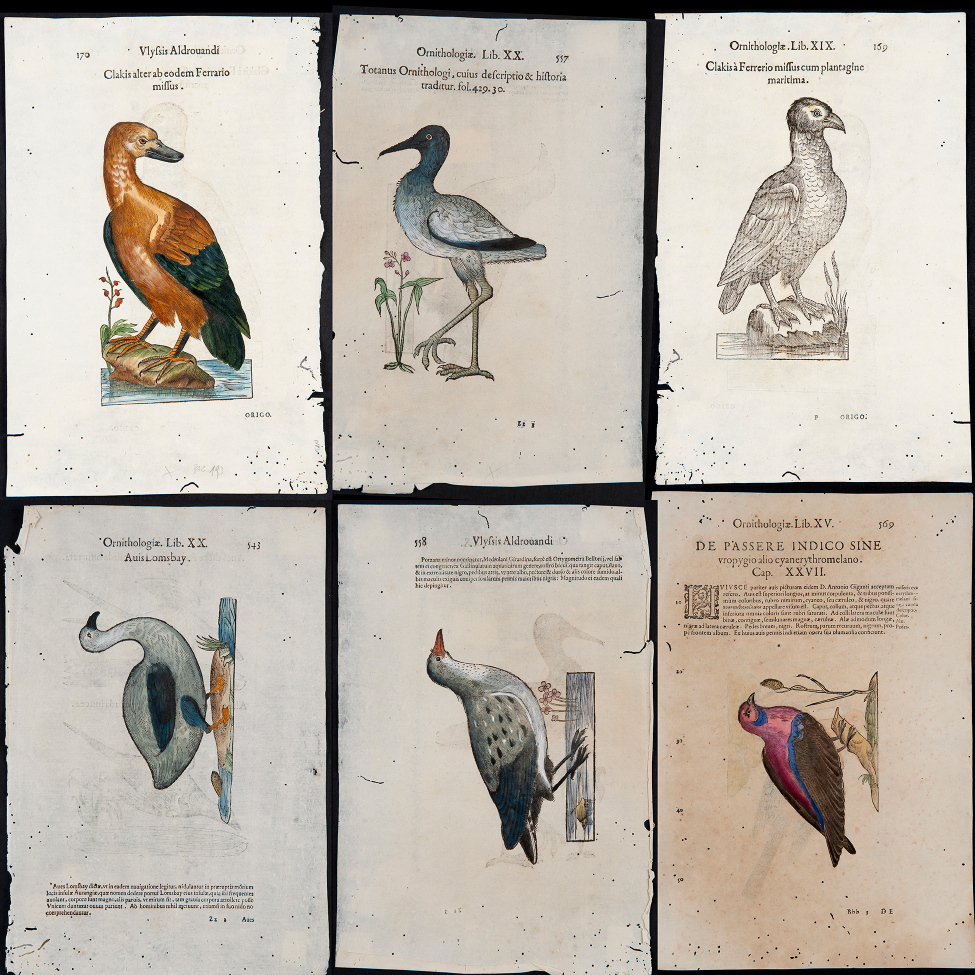 Ulisse Aldrovandi, 'Ornithologiae tomus tertius, ac postremus. Cum indice copiosissimo variarum linguarum', Bologna 1603 Gruppo di sei importanti xilografie tratte dalle edizioni del 1600 e 1603. Eleganti figure di uccelli dipinte su carta vergellata, pr