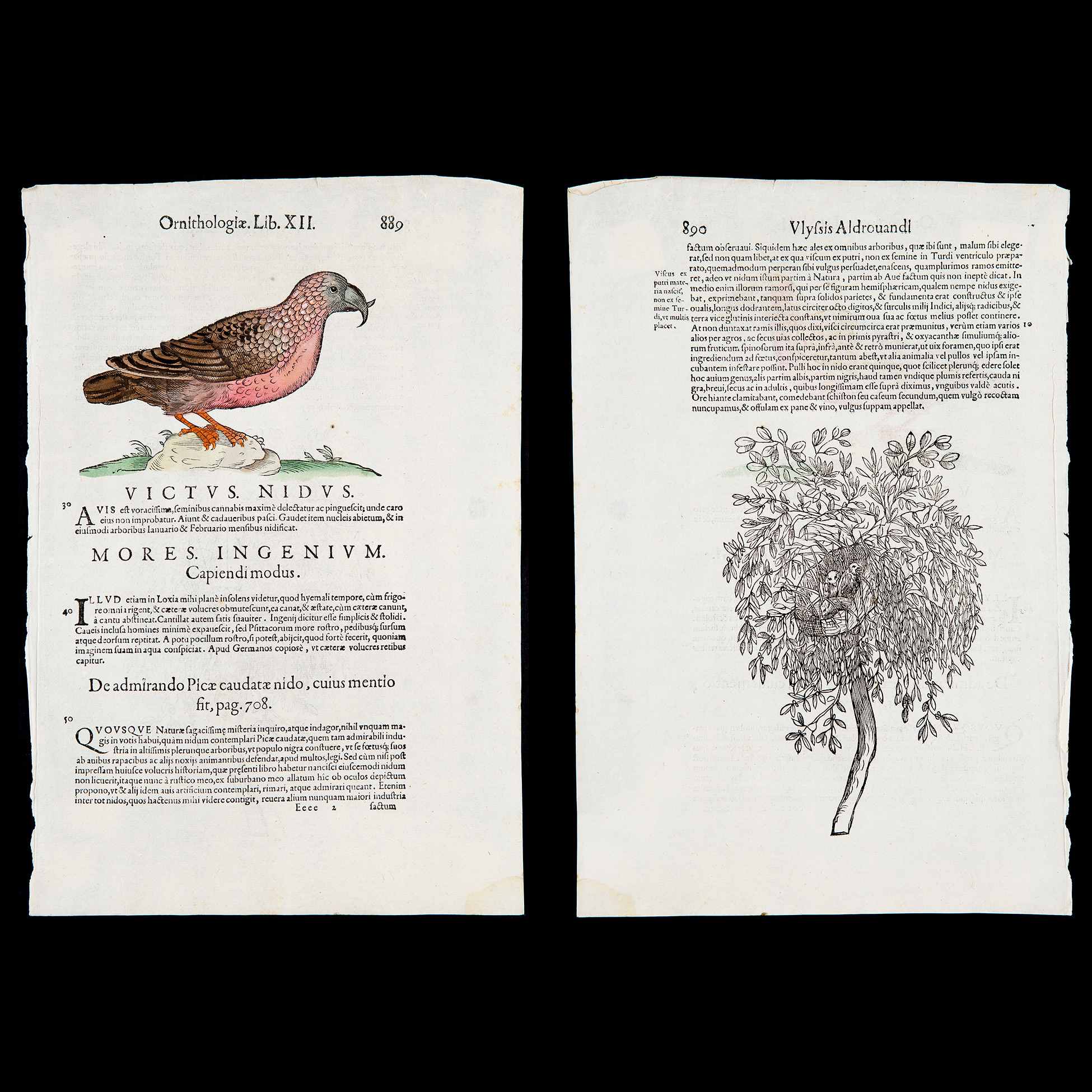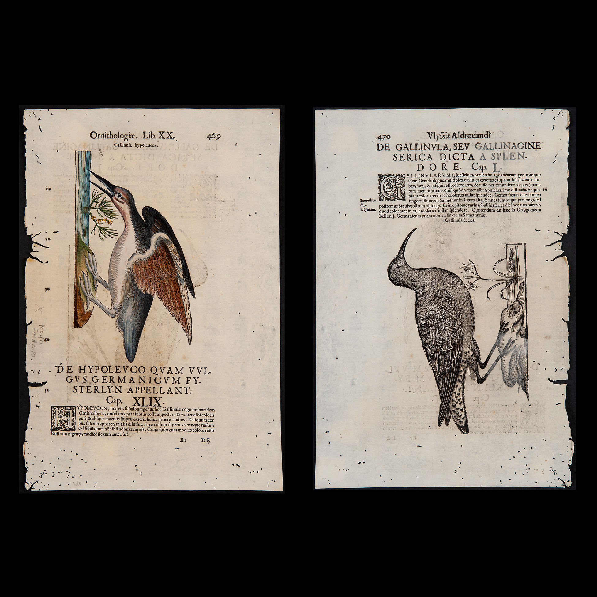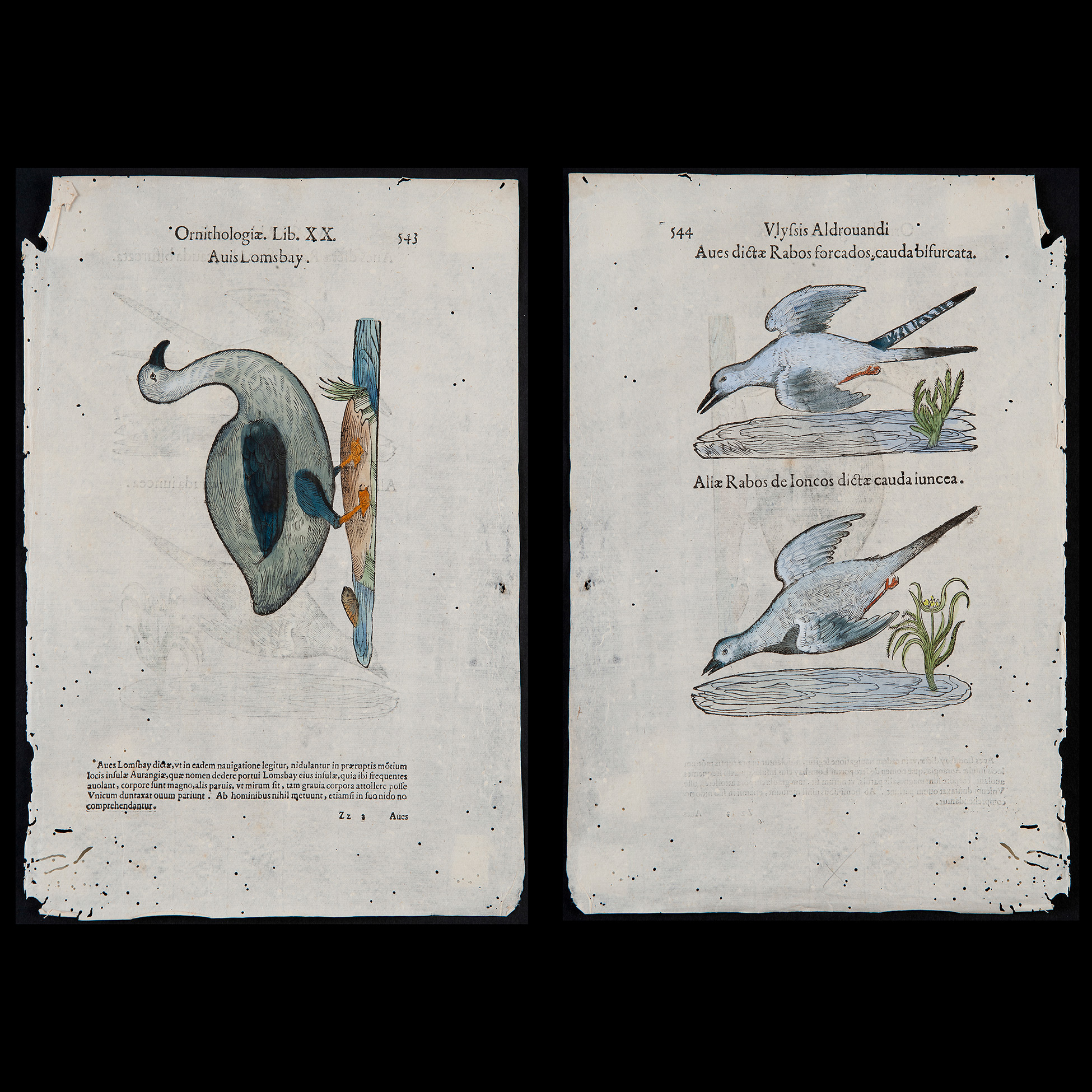 Ulisse Aldrovandi, 'Ornithologiae tomus tertius, ac postremus. Cum indice copiosissimo variarum linguarum', Bologna 1603 Gruppo di sei importanti xilografie tratte dalle edizioni del 1600 e 1603. Eleganti figure di uccelli dipinte su carta vergellata, pr