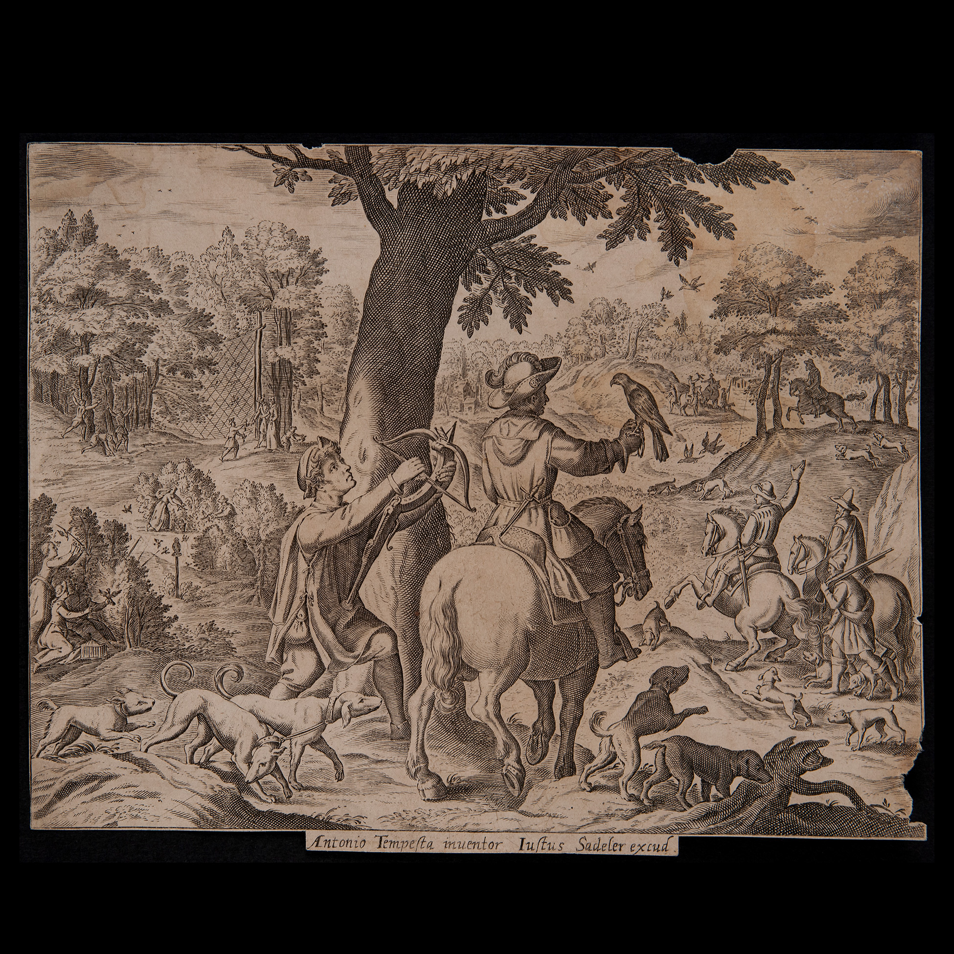 Justus Sadeler (Anversa ca. 1572 - c. 1620), Incisione raffigurante la caccia col falcone, Fiandre inizi del XVII secolo Il soggetto è tratto da un'incisione di Antonio Tempesta raffigurante lo stesso soggetto del 1610-1620 ca. L'opera è realizzata su ca