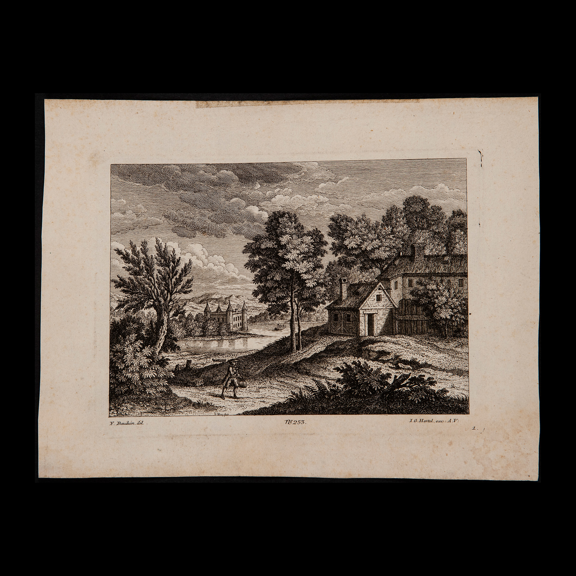 Johann Georg Hertel (1700–1775), Paesaggio con un viandante, Germania 1760 ca. Realizzata su carta vergallata, reca in calce l'iscrizione 'F. Bauduin del. - N 253 - I. Hertel exc : A.V.'. Presenti difetti, priva di cornice Incisione su rame, dimensioni
