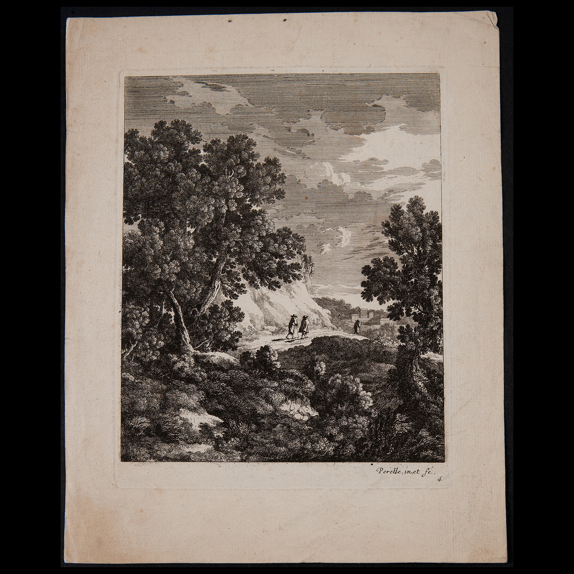 Gabriel Perelle (Vernon 1604 – Parigi 1677), Paesaggio con viandanti, Francia seconda metà del XVIII secolo Realizzata su carta vergellata, reca in calce l'iscrizione 'Perelle. In, et fé'. Presenti difetti, priva di cornice Incisione su rame, dimensioni
