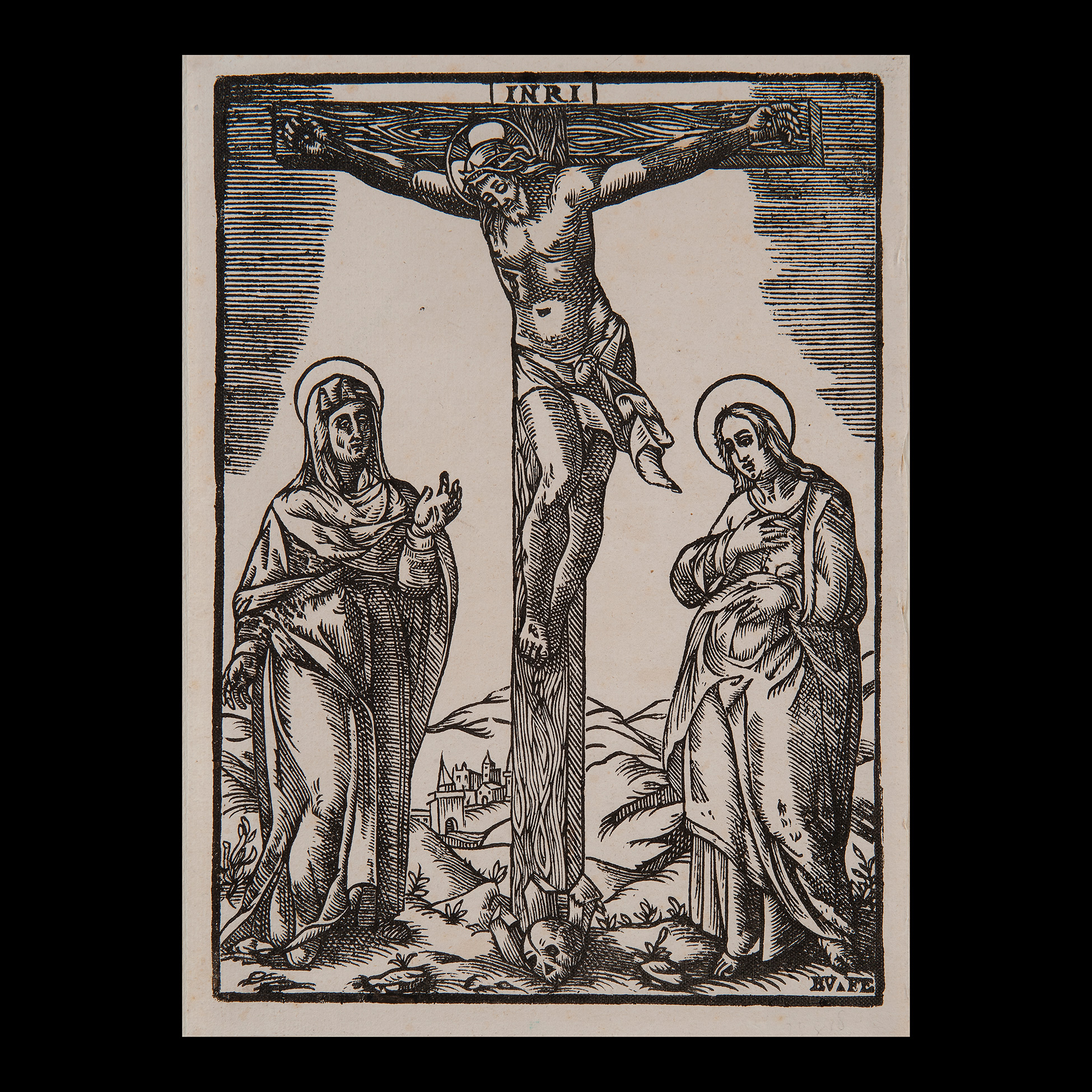 Antica xilografia raffigurante la crocifissione Opera grafica realizzata su carta vergellata, reca in basso a destra il monogramma 'EV.FE'. Presenti difetti, priva di cornice Xilografia su carta, dimensioni 25x18 cm.