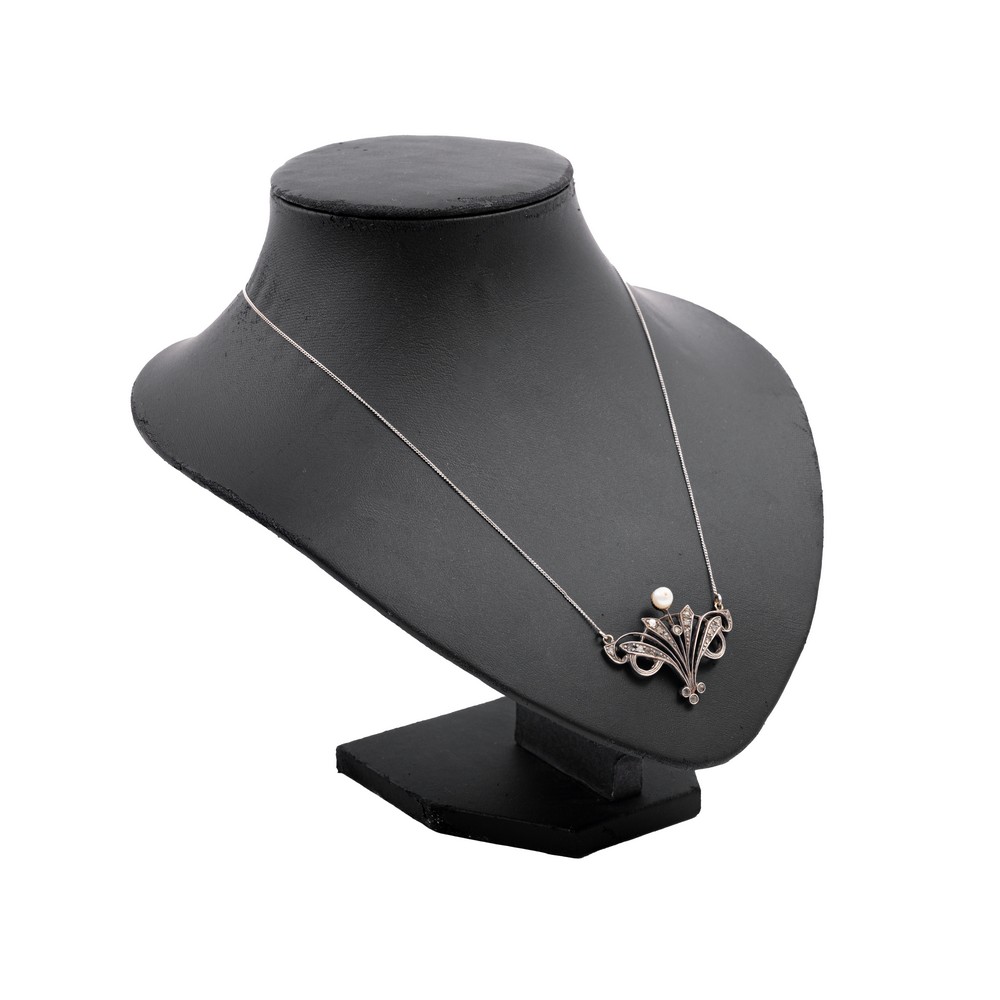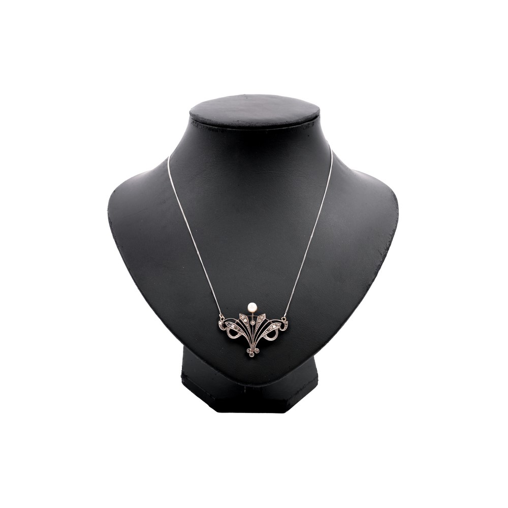 COLLANA in oro bianco 18 KT con pendente in argento con diamanti ct. 0,10 e perla coltivata (g. 7,30).