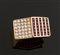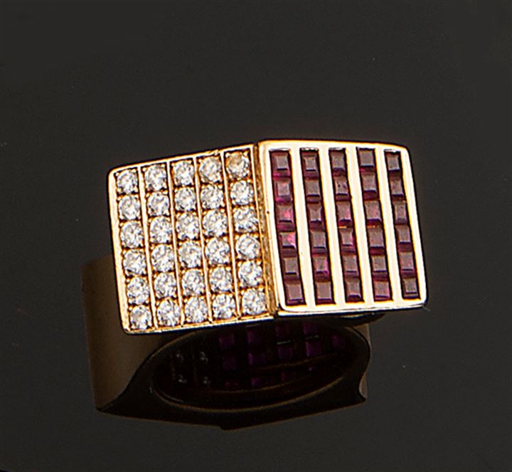 Anello in oro giallo, sommità piatta a gradino, con diamanti taglio brillante per complessivi ct 0,60 e rubini taglio carrè
