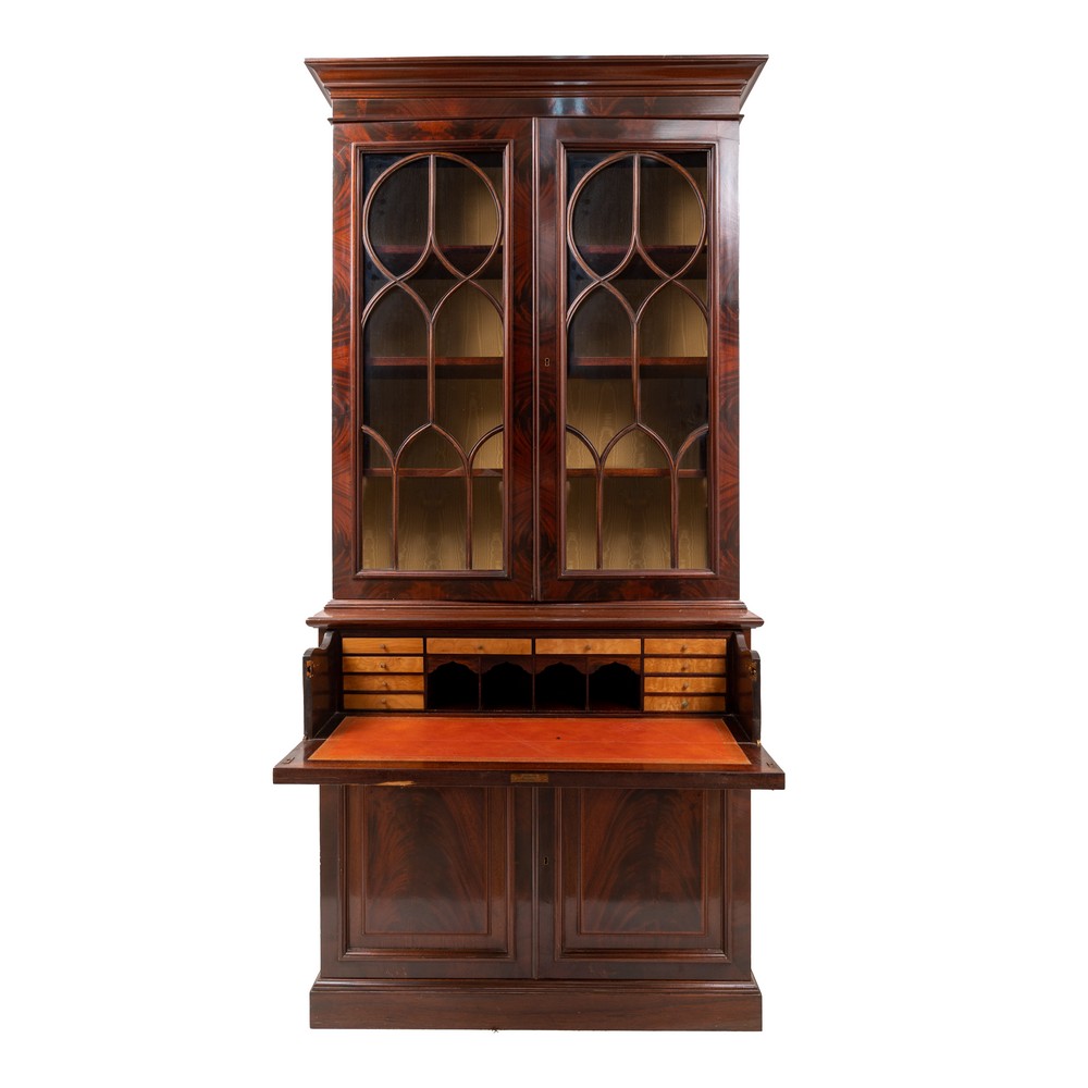 VETRINA doppio corpo in legno di mogano a due ante e cassetti nella parte inferiore e due ante a giorno in quella superiore.