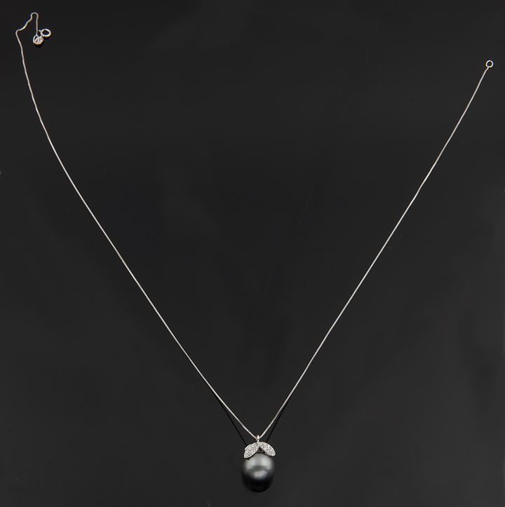 Catena con ciondolo in oro bianco con perla Tahiti del diam di mm 11,7 sormontata da due foglie in diamanti taglio brillante per complessivi ct 0,13 ca