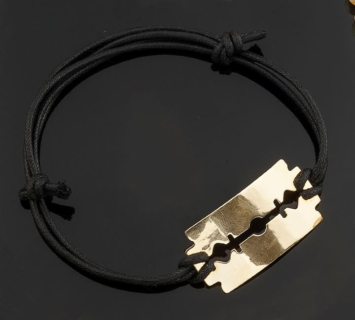 Bracciale recante lametta stilizzata in oro giallo; cordoncino in tessuto