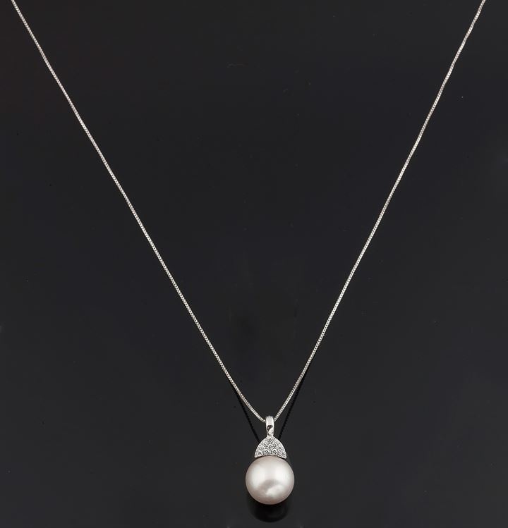 Catena con ciondolo in oro bianco recante perla australiana del diam di mm 12,3 sormontata da triangolo in diamanti taglio brillante per complessivi ct 0,12 ca