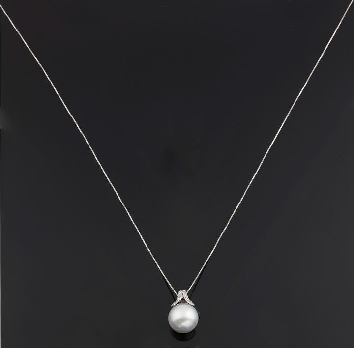 Catena con ciondolo in oro bianco con perla australiana del diam di mm 13,4 e diamanti taglio brillante per complessivi ct 0,15 ca
