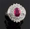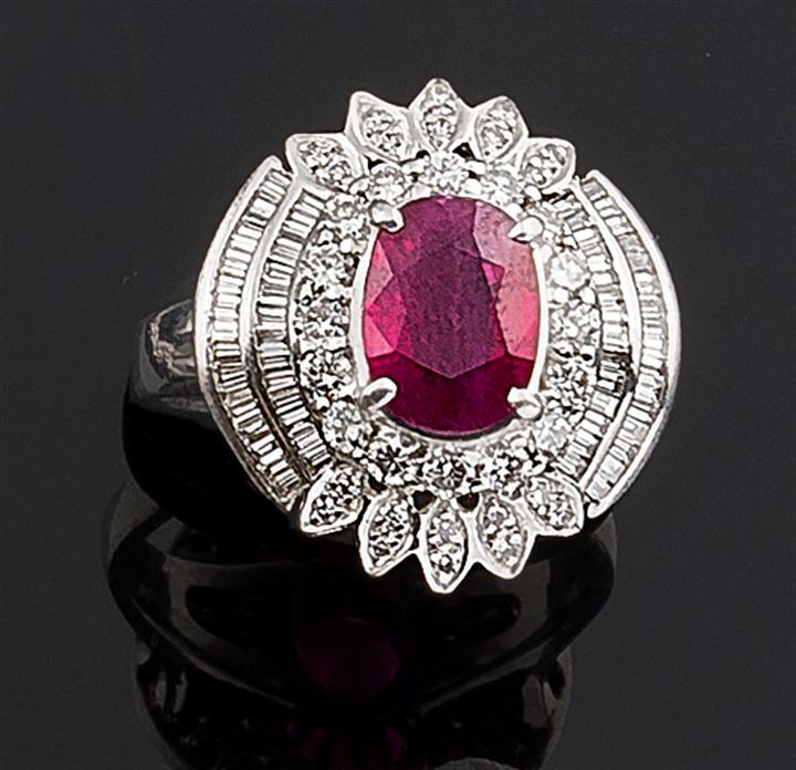 Anello in oro bianco con al centro rubino taglio ovale, contorno di diamanti taglio baguette e brillante per complessivi ct 2,10 ca