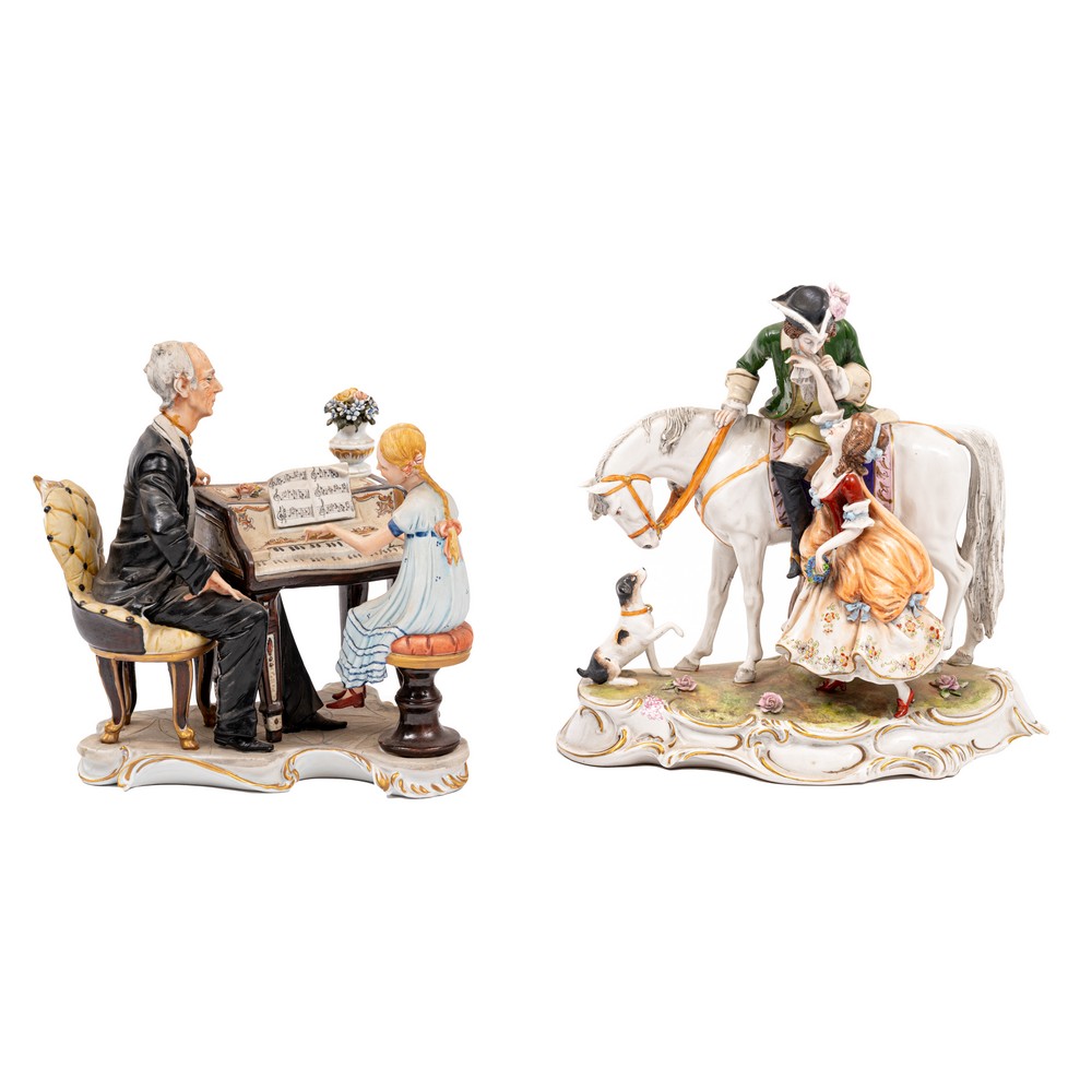 DUE GRUPPI in porcellana Capodimonte raffigurante scena galante e maestro di piano (usure).