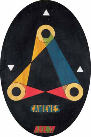 Ugo Nespolo Mosso 1941 Camenes, 1974 tecnica mista su legno, cm 119x78,5. Firmato al verso: Nespolo. Al verso etichetta Nespolo Studio