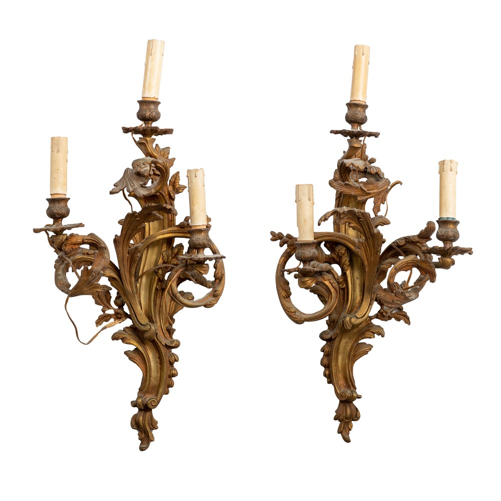 COPPIA DI APPLIQUE stile Luigi XV in bronzo dorato a tre luci.