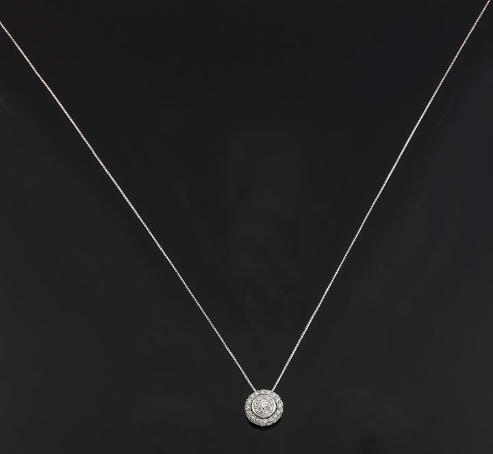 Catena con ciondolo in oro bianco a forma di cerchio con diamanti taglio brillante per complessivi ct 0, 60 ca