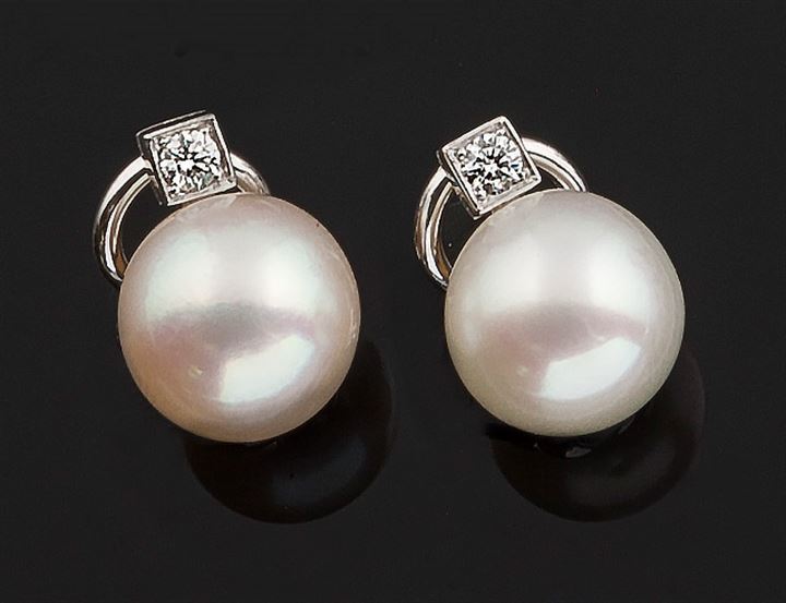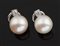 Coppia di orecchini in oro bianco, a monachella, con due perle australiane del diam di mm 10,8