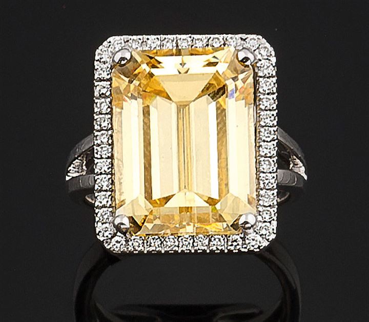 Anello in oro bianco, sommità di forma geometrica, con quarzo citrino taglio rettangolare circondato da