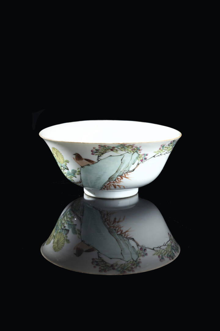 Ciotola in porcellana decorata con uccello su roccia e iscrizione, Cina, dinastia Qing, XIX secolo.