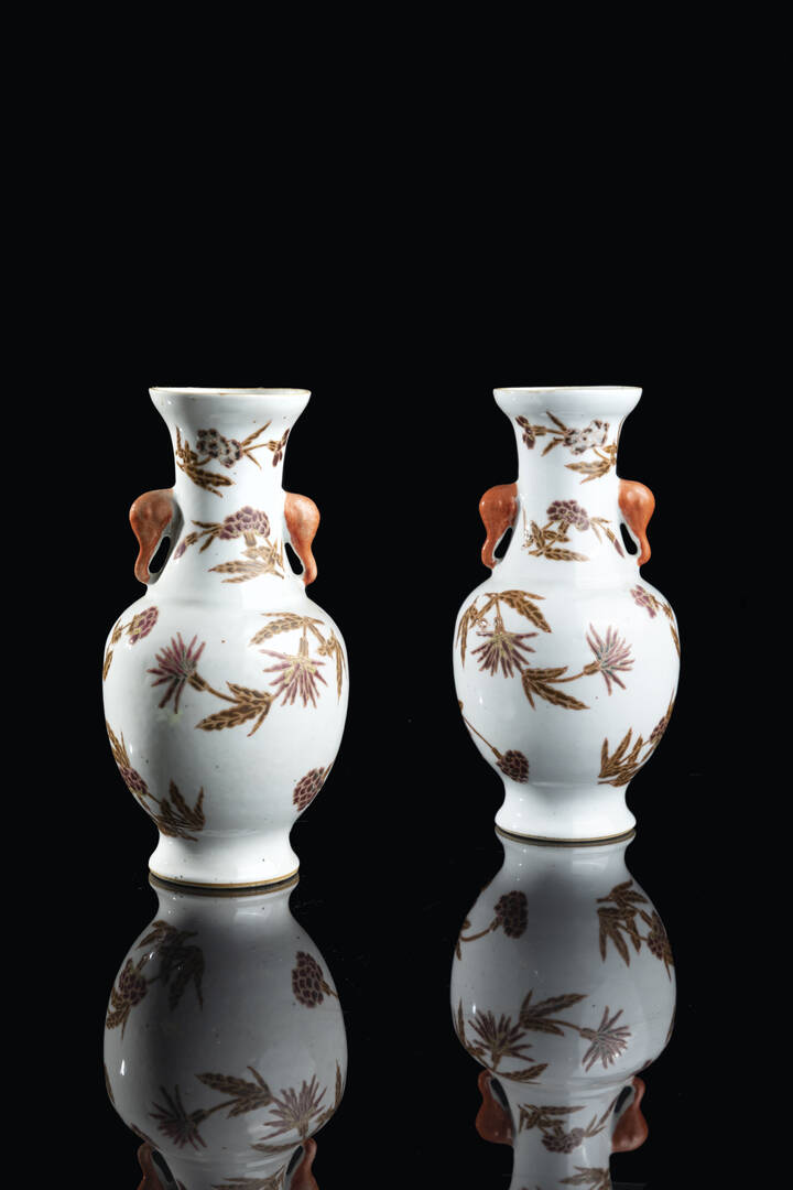 Coppia di vasi in porcellana con decori floreali e manici a forma di elefante, Cina, dinastia Qing, XX secolo.
