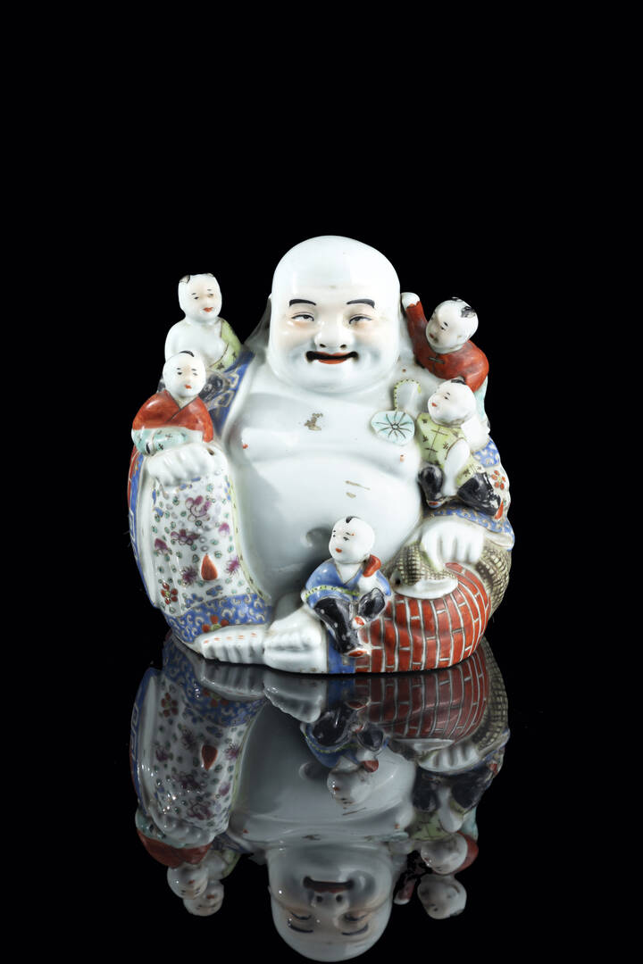 Budai in porcellana policroma con bambini, Cina, Repubblica, XX secolo.