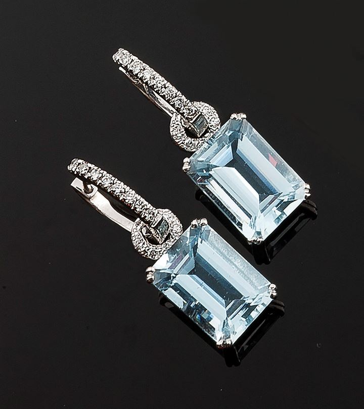Coppia di orecchini pendenti in oro bianco con due acquamarine taglio rettangolare sormontate da diamanti taglio brillante per complessivi ct 0,35 ca