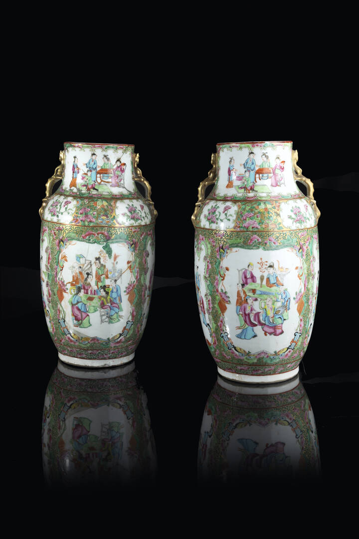 Coppia di vasi Canton dipinti con scene di vita quaotidiana con mainici dorati a forma di drago, Cina, dinastia Qing, XX secolo.