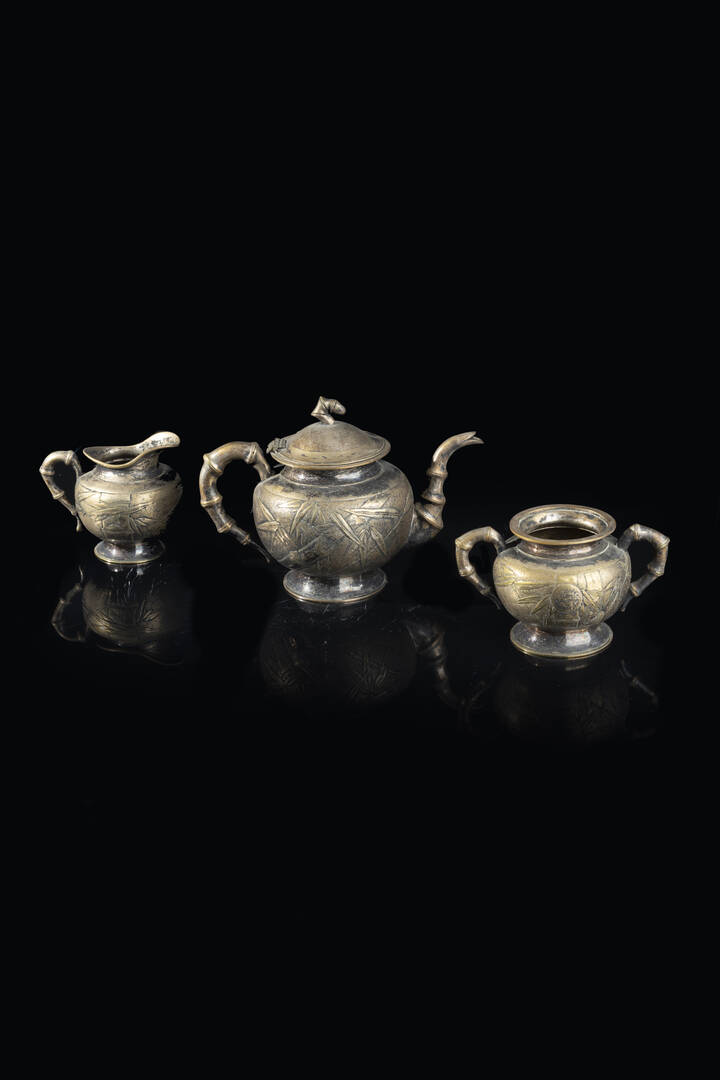 Servizio da tè composto da teiera, zuccheriera e lattiera in metallo argentato, Cina, Repubblica, XX secolo.