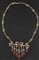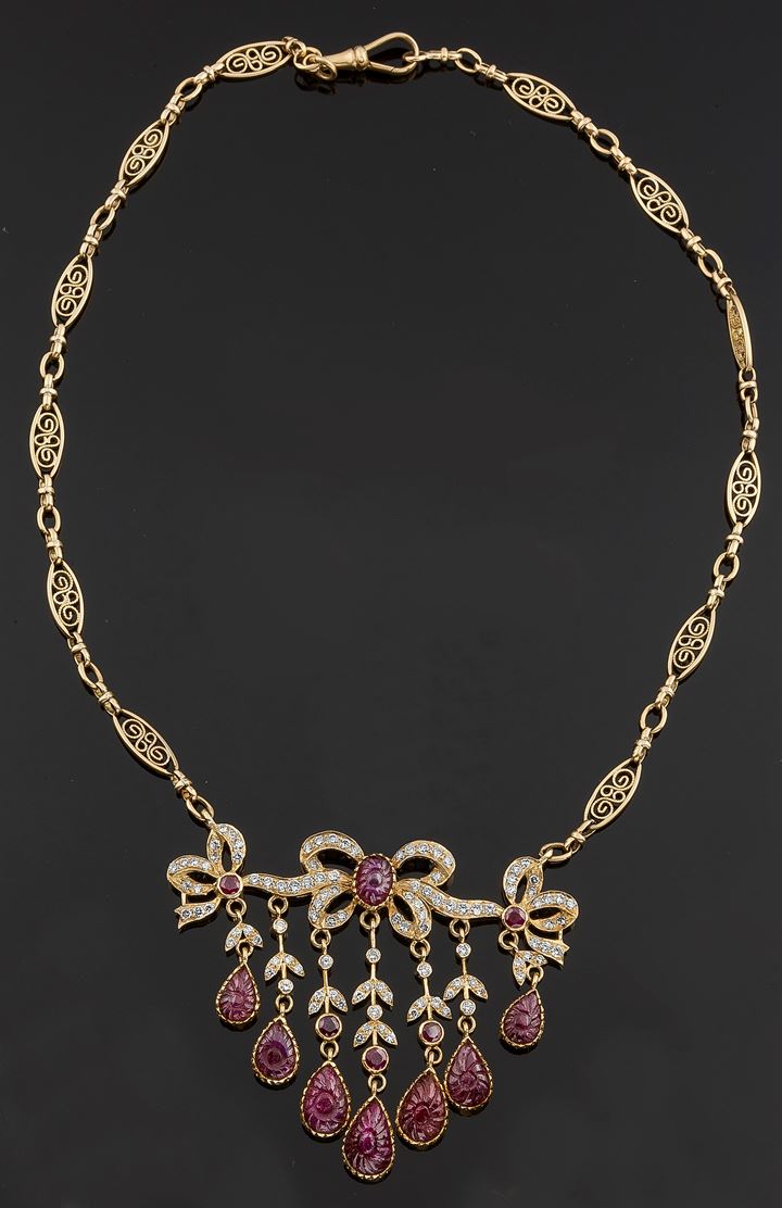 Collana in oro giallo, parte centrale lavorata a fiocco con al centro rubino inciso, cinque rubini taglio rotondo e sette rubini incisi pendenti; diamanti taglio brillante per complessivi ct 2,0 ca