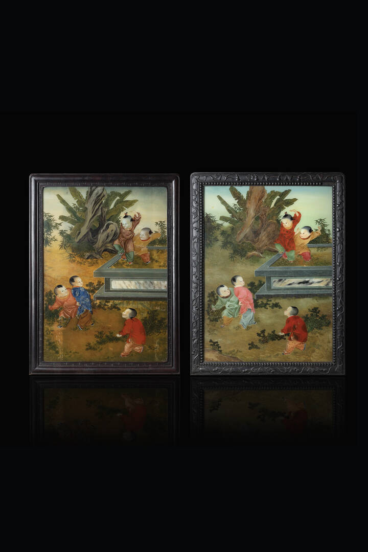 Coppia di dipinti su vetro raffigurante bambini che giocano, Cina, dinastia Qing, XIX secolo.