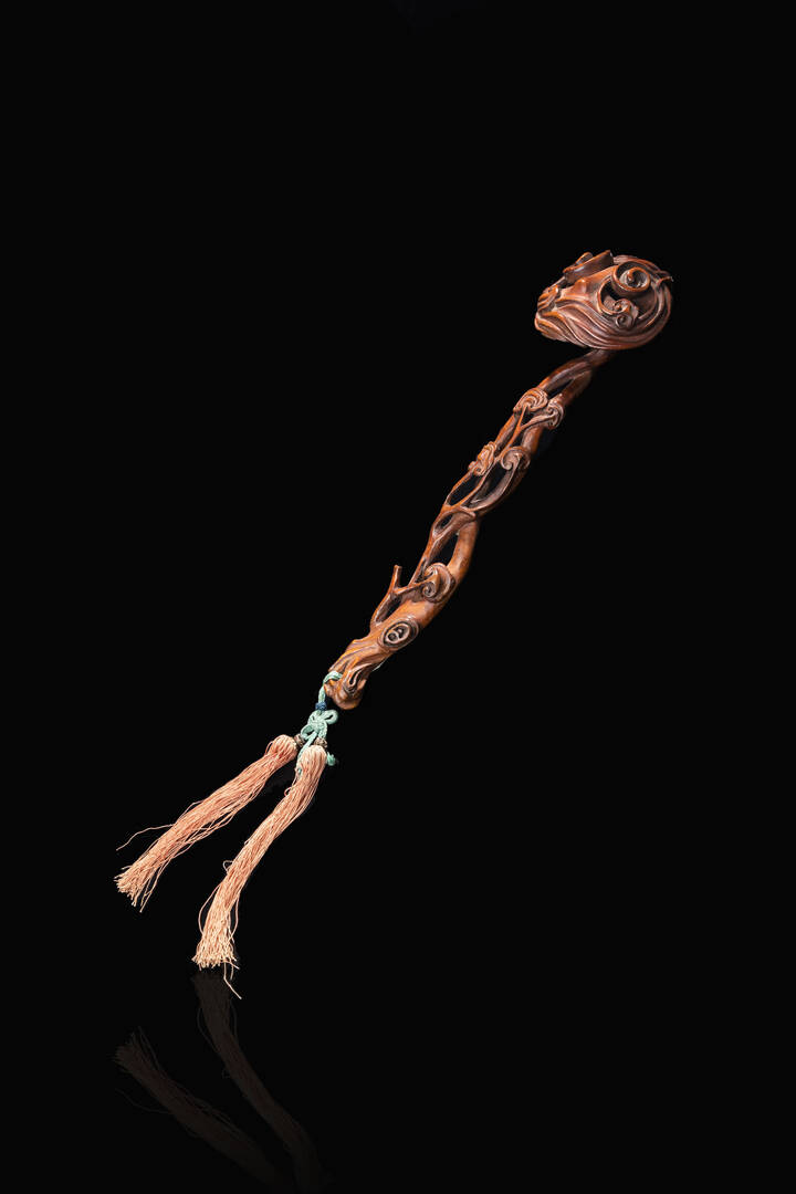 Ruyi scolpito in lego di bosso con decoro a rilievo di fiori di loto, Cina, XX secolo.