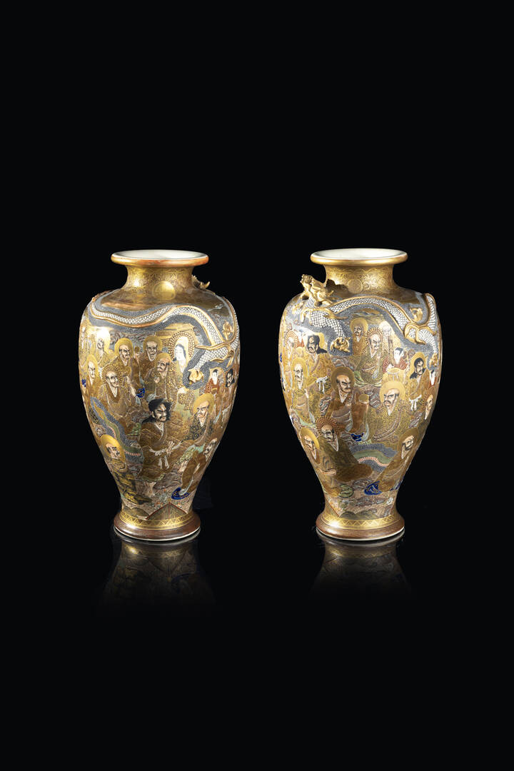 Coppia di vasi in porcellana Satsuma dipinti con personaggi e drago a rilievo, Giappone, XX secolo.