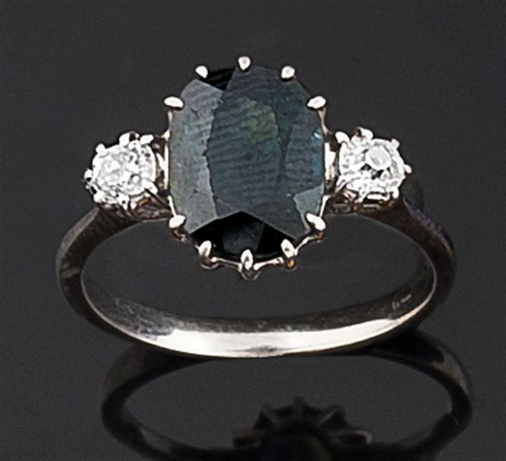 Anello in oro bianco con al centro zaffiro di taglio ovale ed ai lati due diamanti taglio brillante