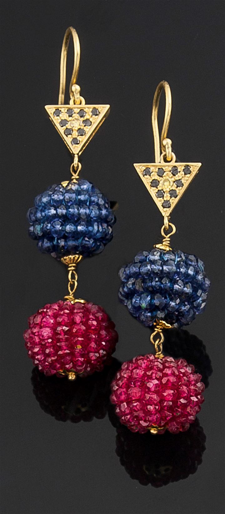Coppia di orecchini pendenti in oro giallo con triangoli in diamanti taglio brillante di colore bianco e nero e due boules composte da piccole sfere sfaccettate in zaffiri e rubini