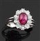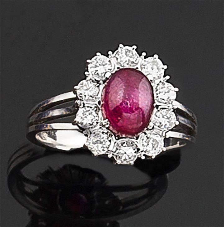 Anello oro bianco recante al centro un rubino taglio cabochon circondato da dieci diamanti taglio brillante per complessivi ct 0,75 ca