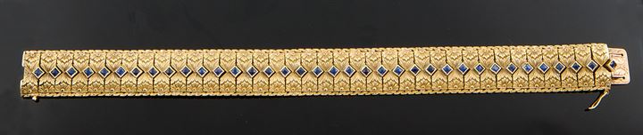 Bracciale in oro giallo, lavorato a segmenti decorati con fiori recanti al centro zaffiri taglio rotondo